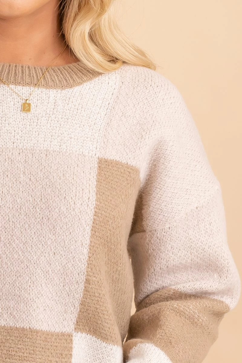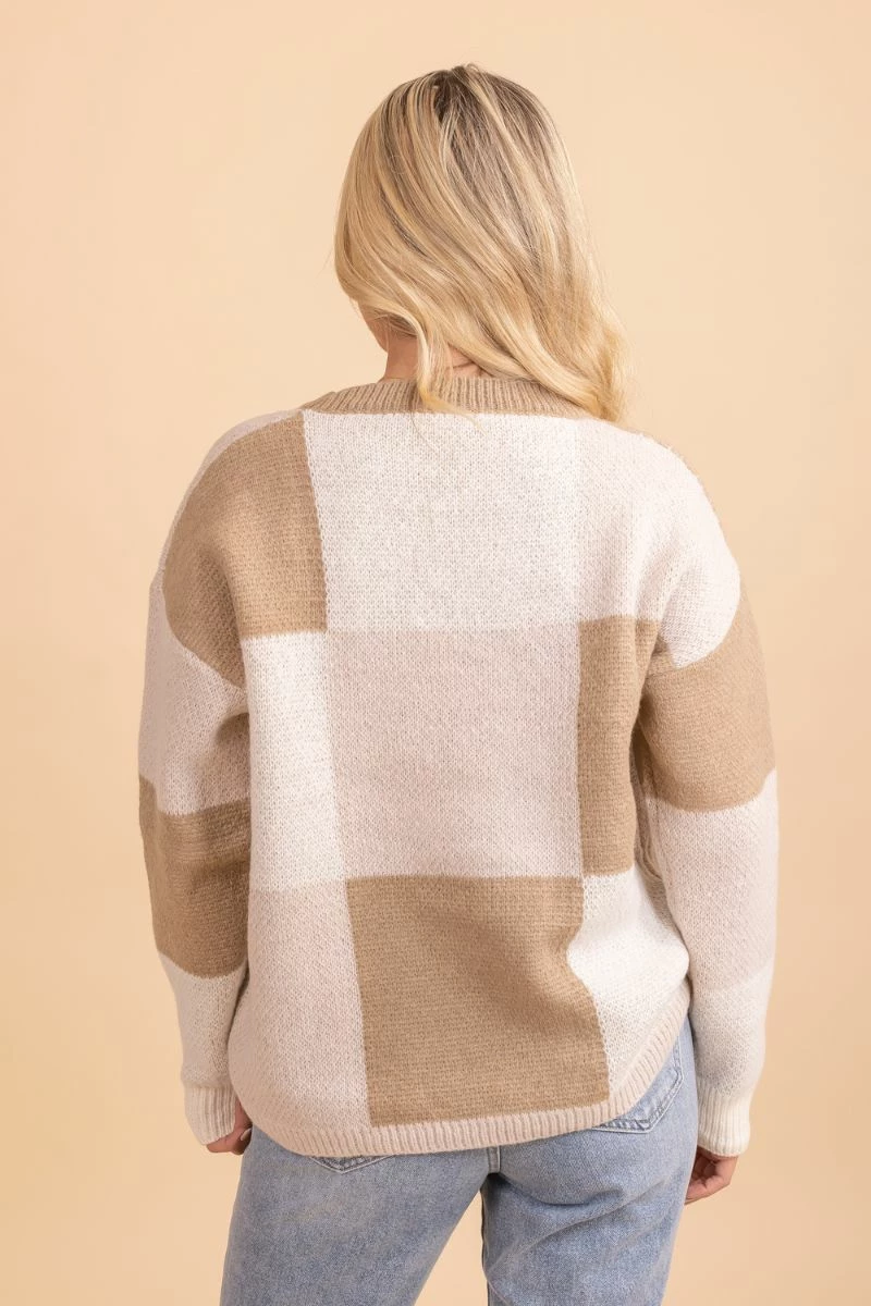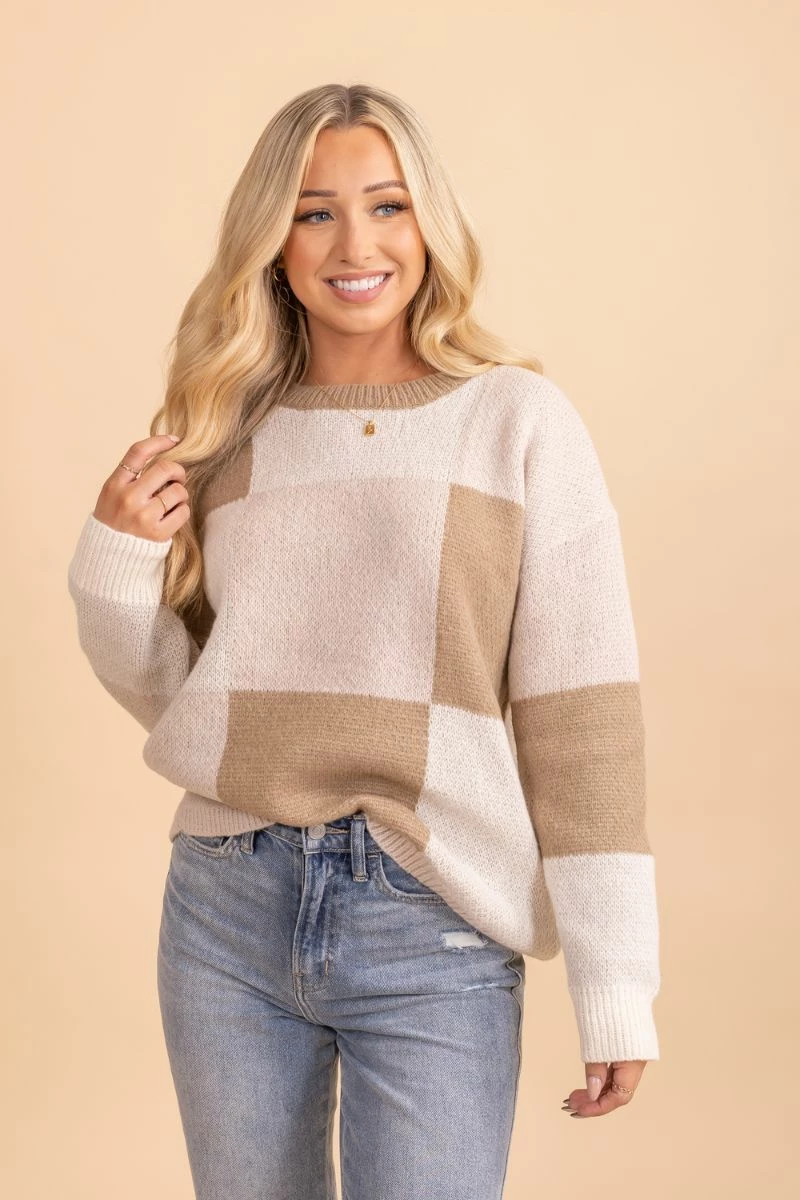Our Be Groovy Checkered Sweater is a fall must-have! This sweater features a trendy neutral checkered pattern, cozy long sleeves, and rounded neckline. The stretchy, soft knit material make this sweater so comfy for the chilly days ahead!