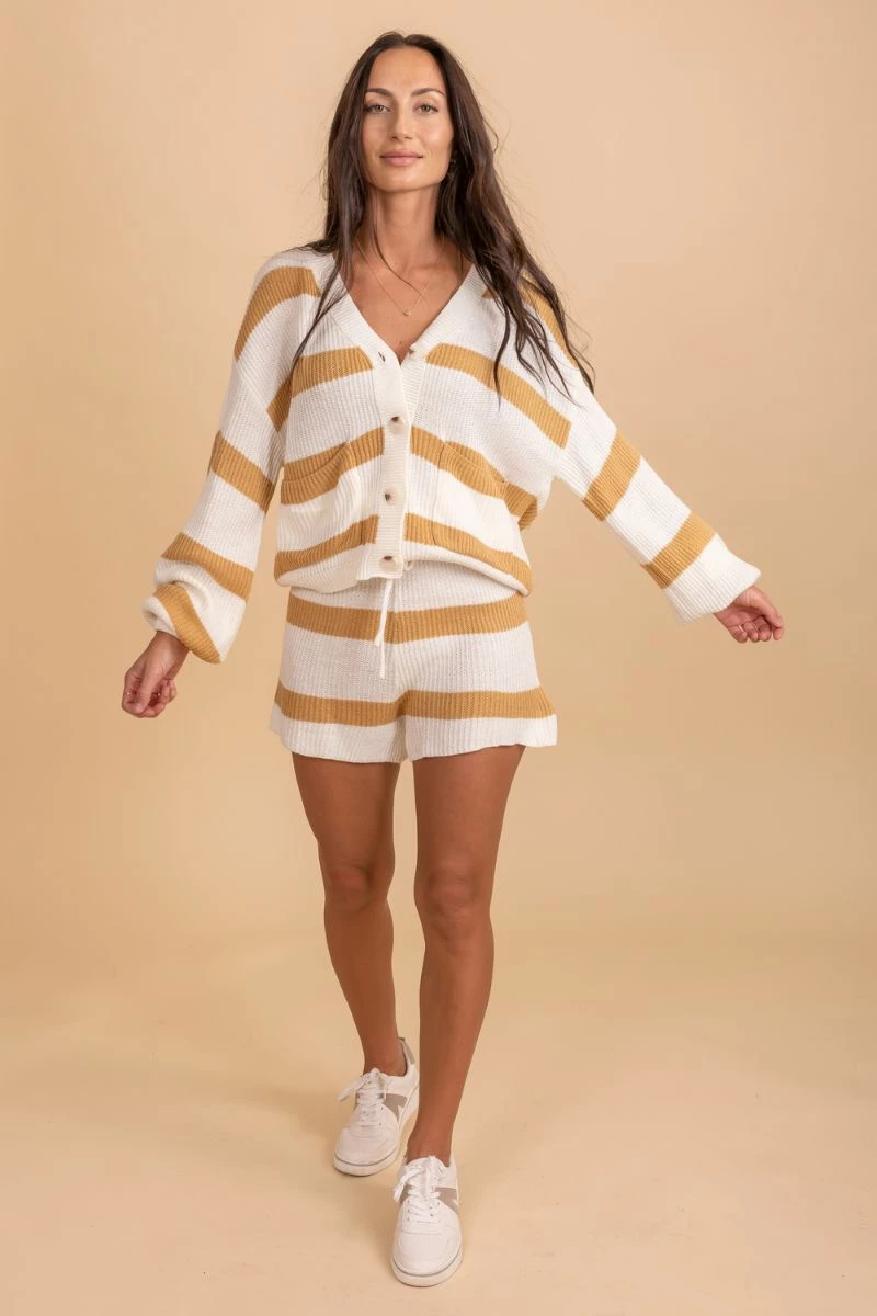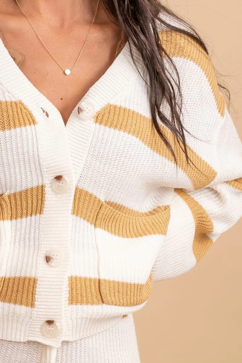 Our new Begin Now Striped Sweater Set is to die for! This two-piece set has the perfect sweater knit material that is so cozy and cute. The top has a full button up v-neck and long sleeves! We are in love with the cutest yellow and white stripes! This set is a relaxed loose fit and is very comfortable.