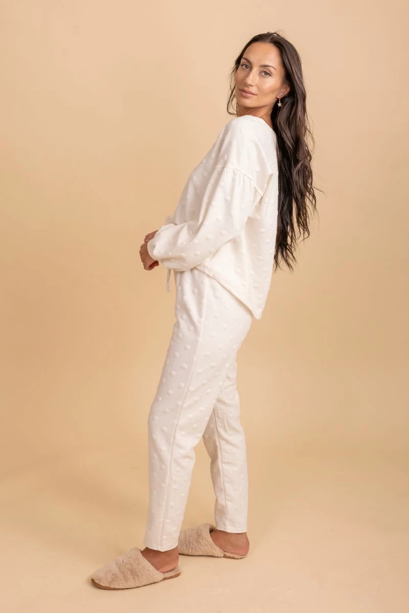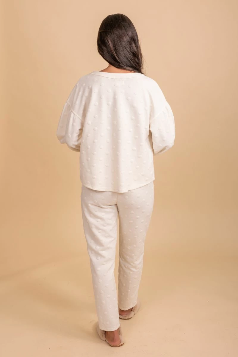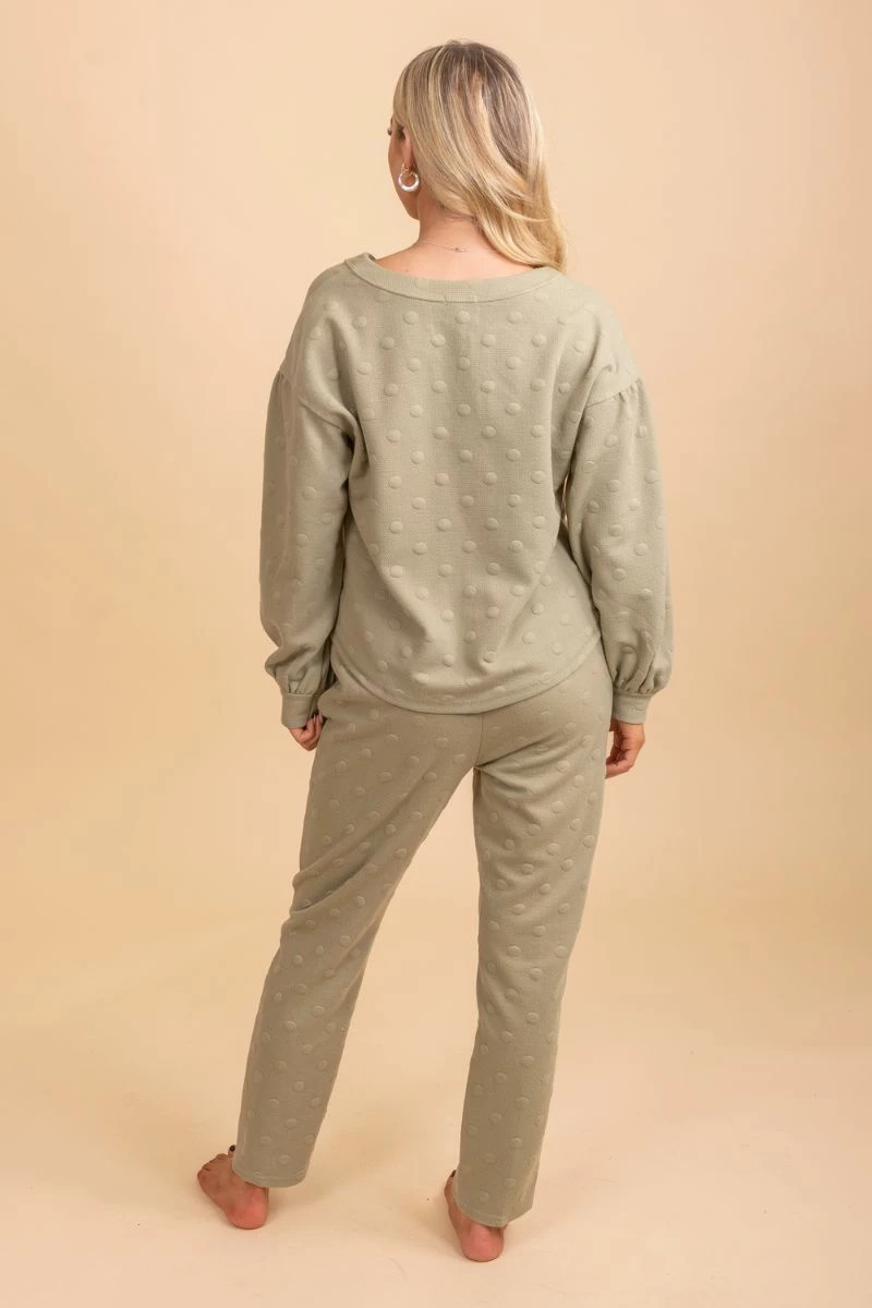 Our new Love Me Back Swiss Dot Sweater Set is to die for! This two-piece set has the perfect sweater knit material that is so cozy and cute. The top has a button collared v-neck and long sleeves! We are absolutely obsessed with the swiss dot detail! This set is a relaxed fit and very comfortable.