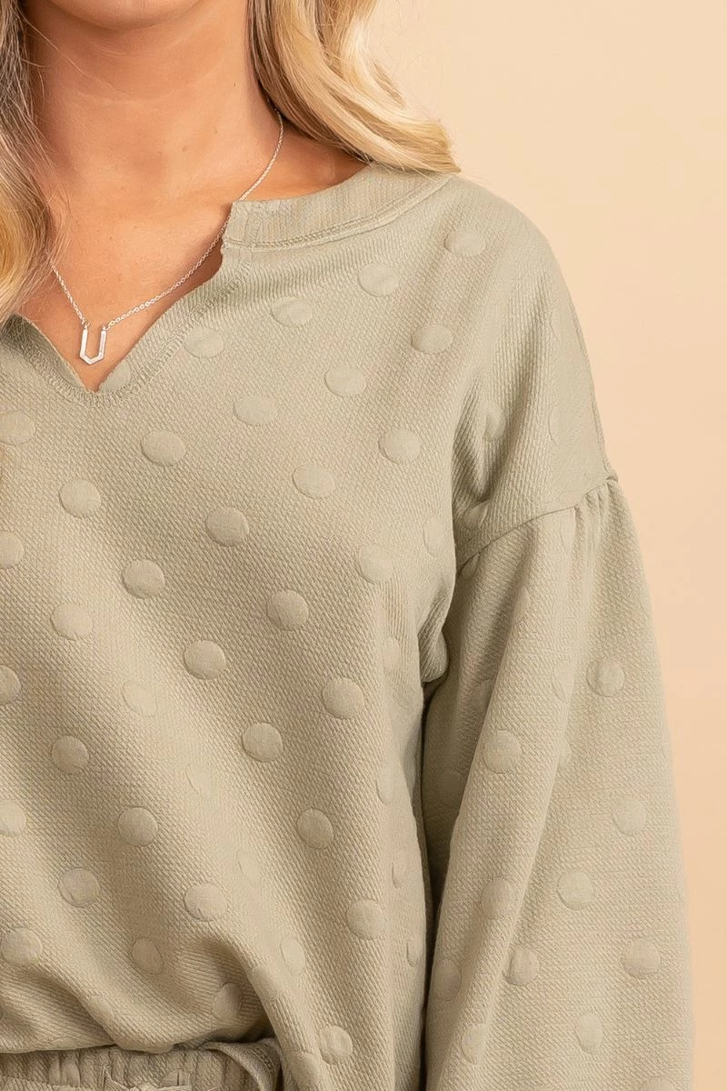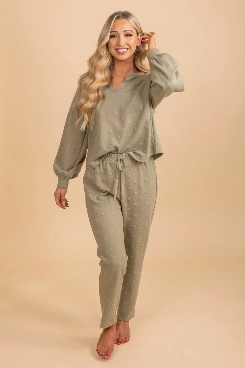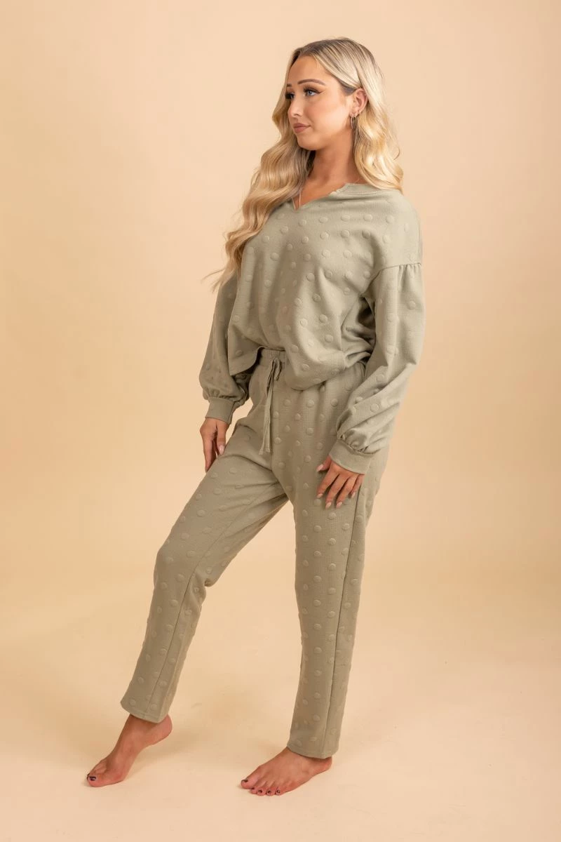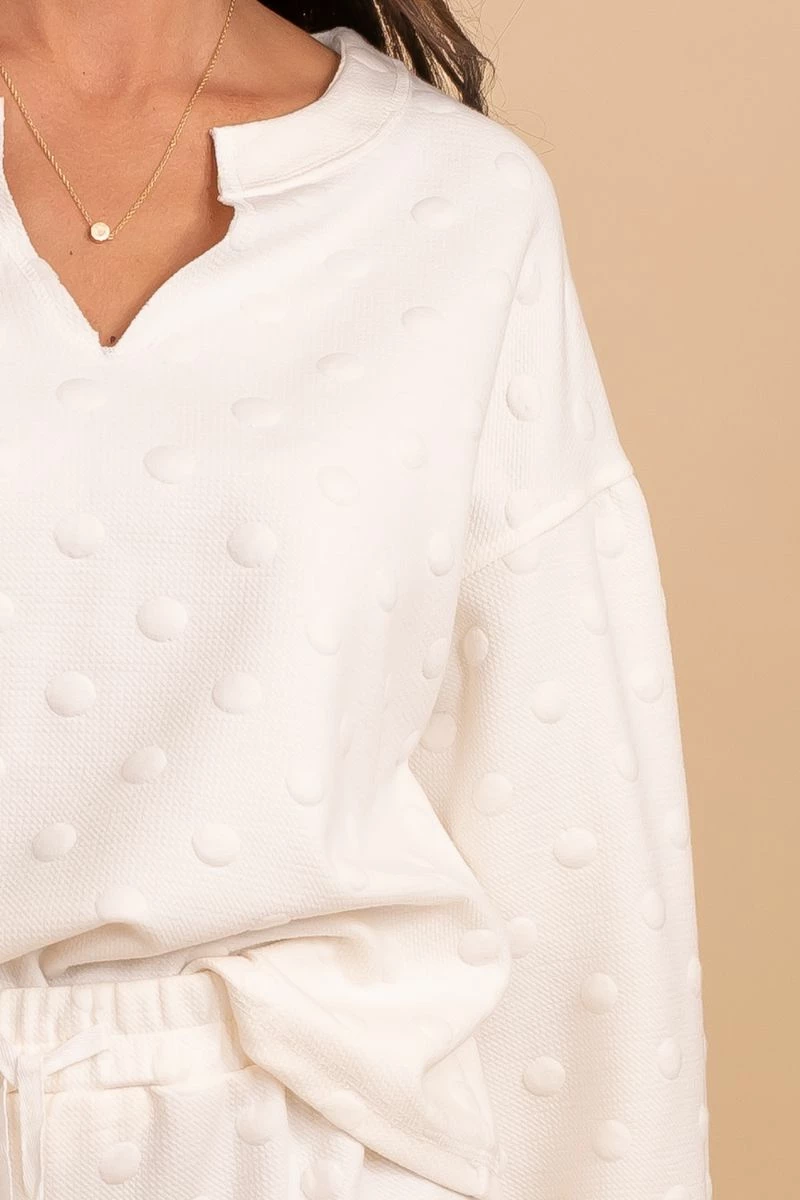 Our new Love Me Back Swiss Dot Sweater Set is to die for! This two-piece set has the perfect sweater knit material that is so cozy and cute. The top has a button collared v-neck and long sleeves! We are absolutely obsessed with the swiss dot detail! This set is a relaxed fit and very comfortable.