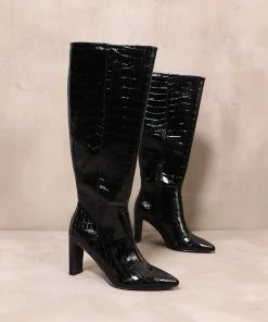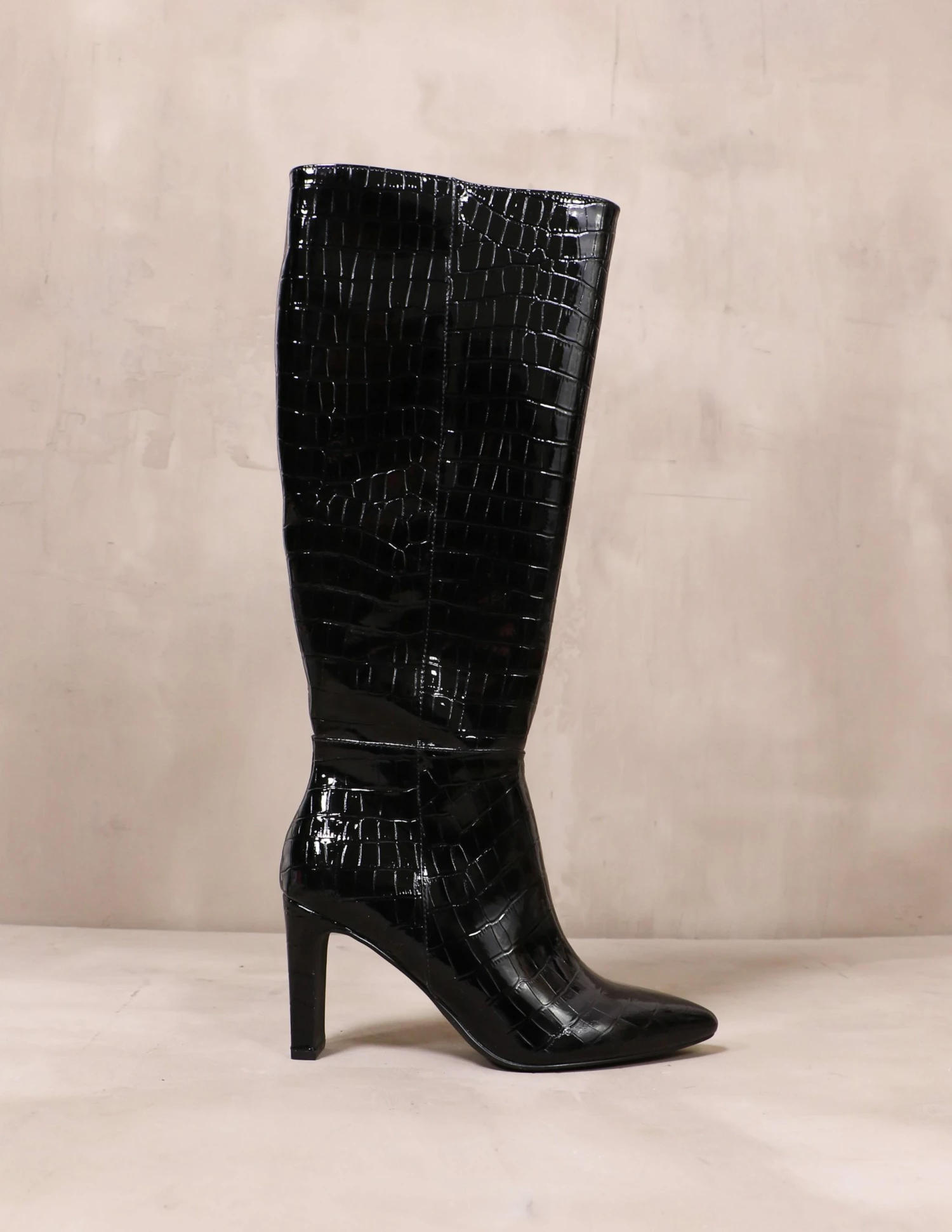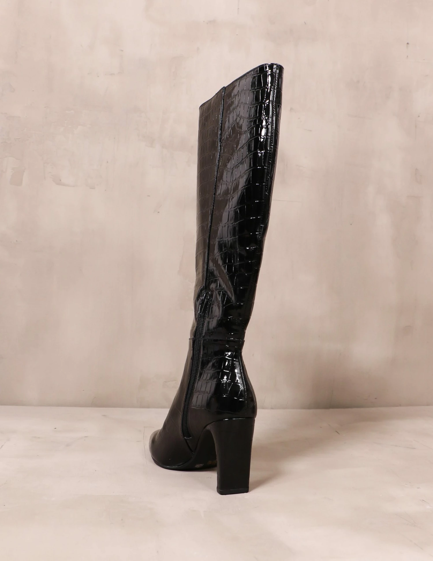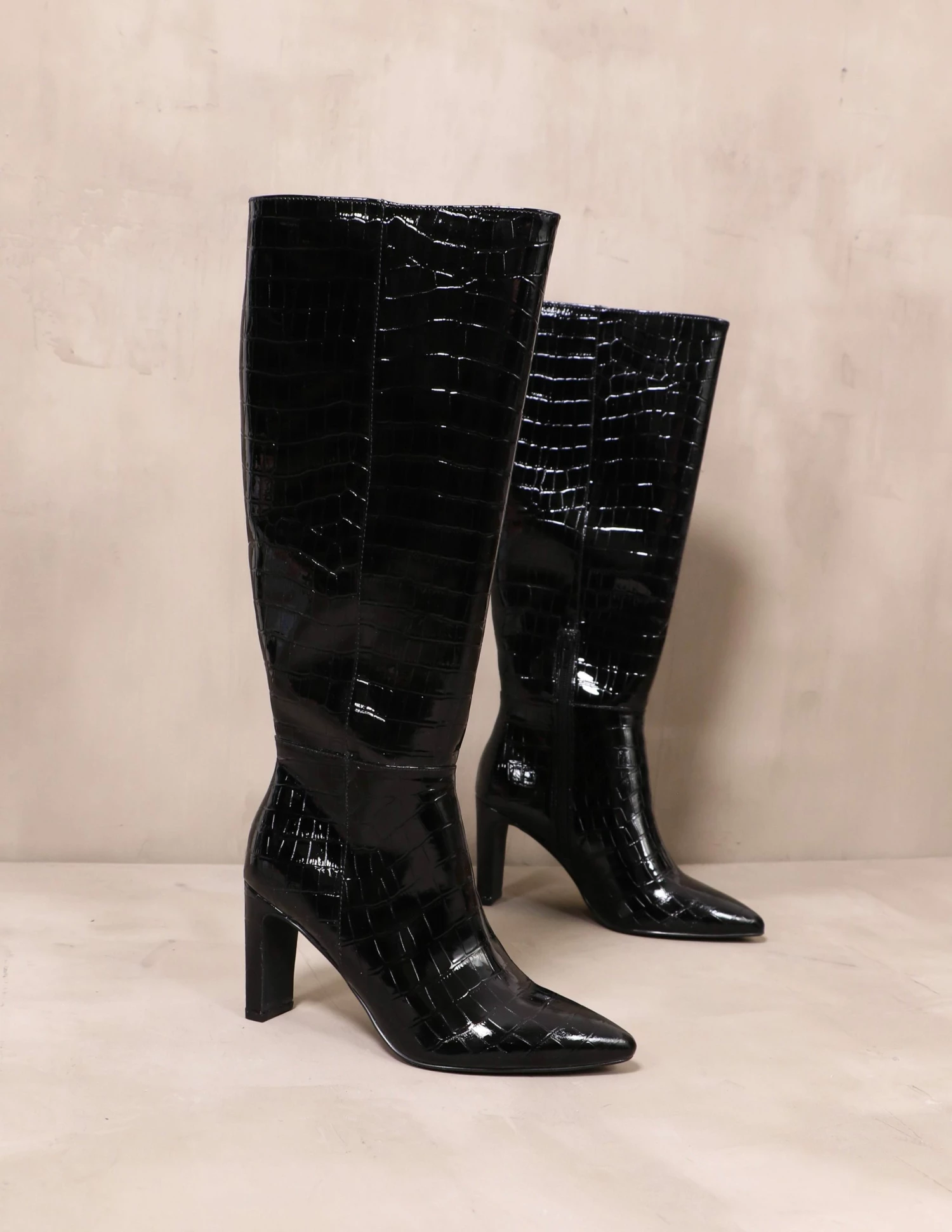 Channel your inner rocker with our Croc On Babe Boots. Designed with a pointed toe, patent faux croc upper, and a rectangular heel. Pair your Croc On Babe Boots with your favorite concert tee to create a chic look.