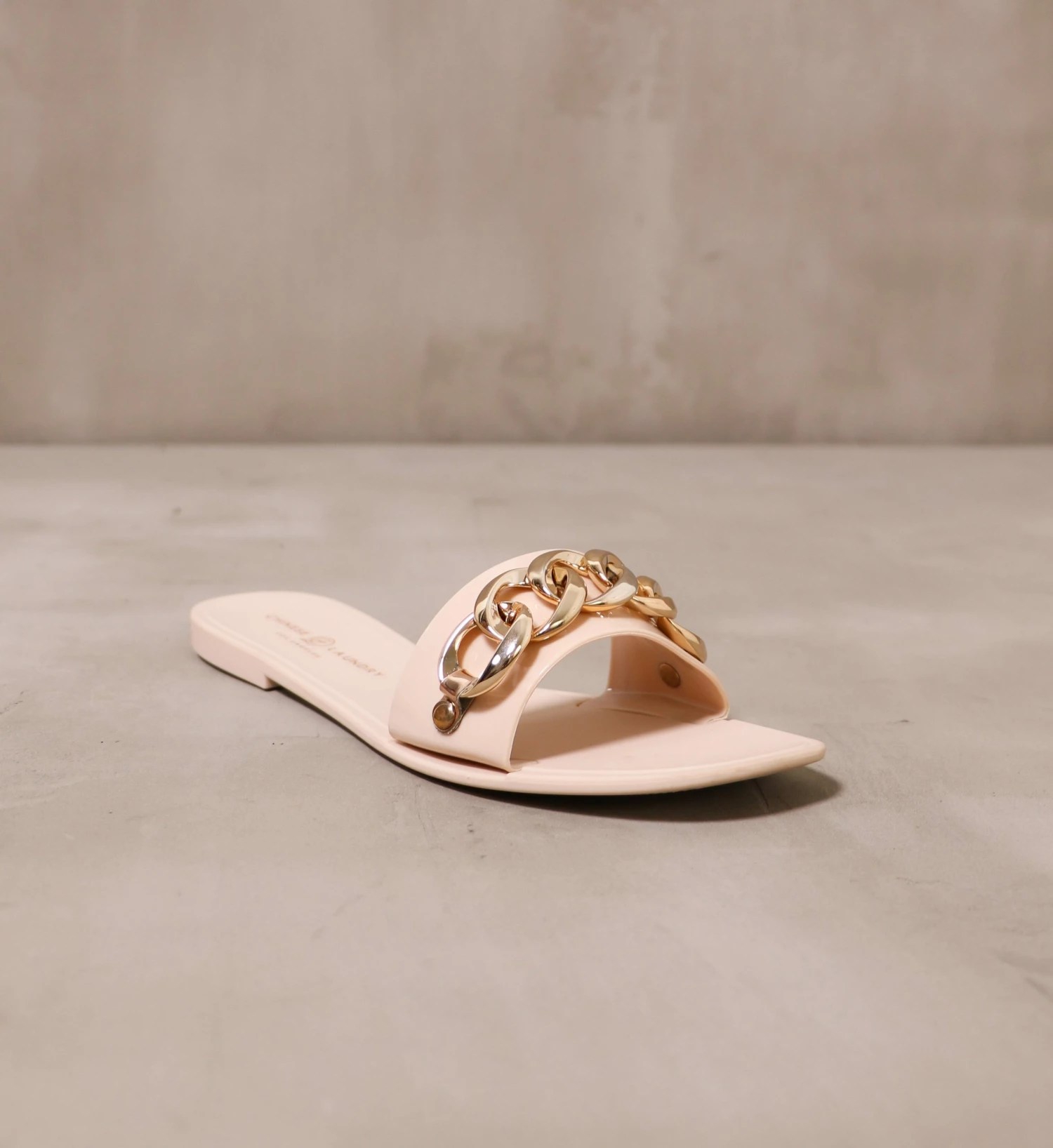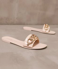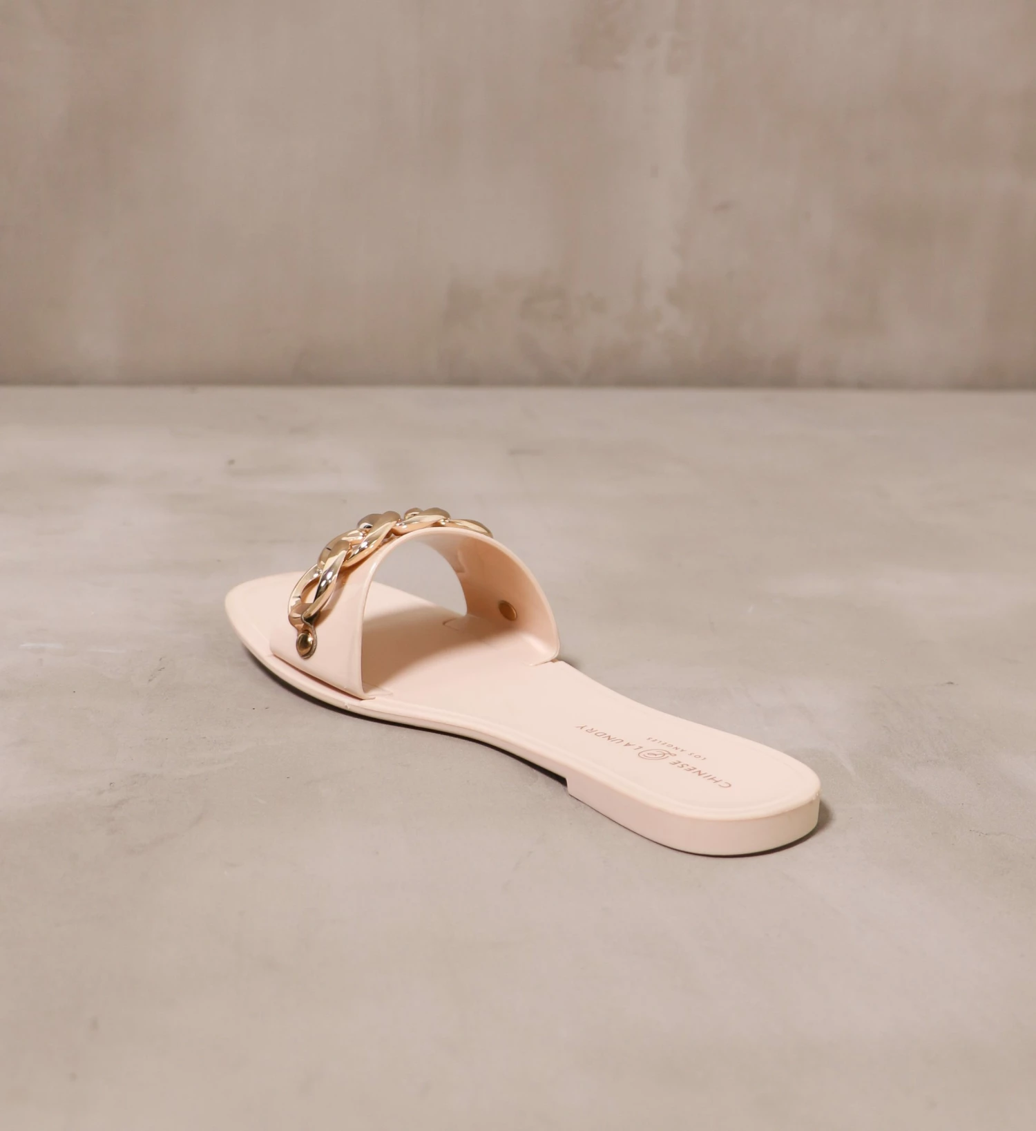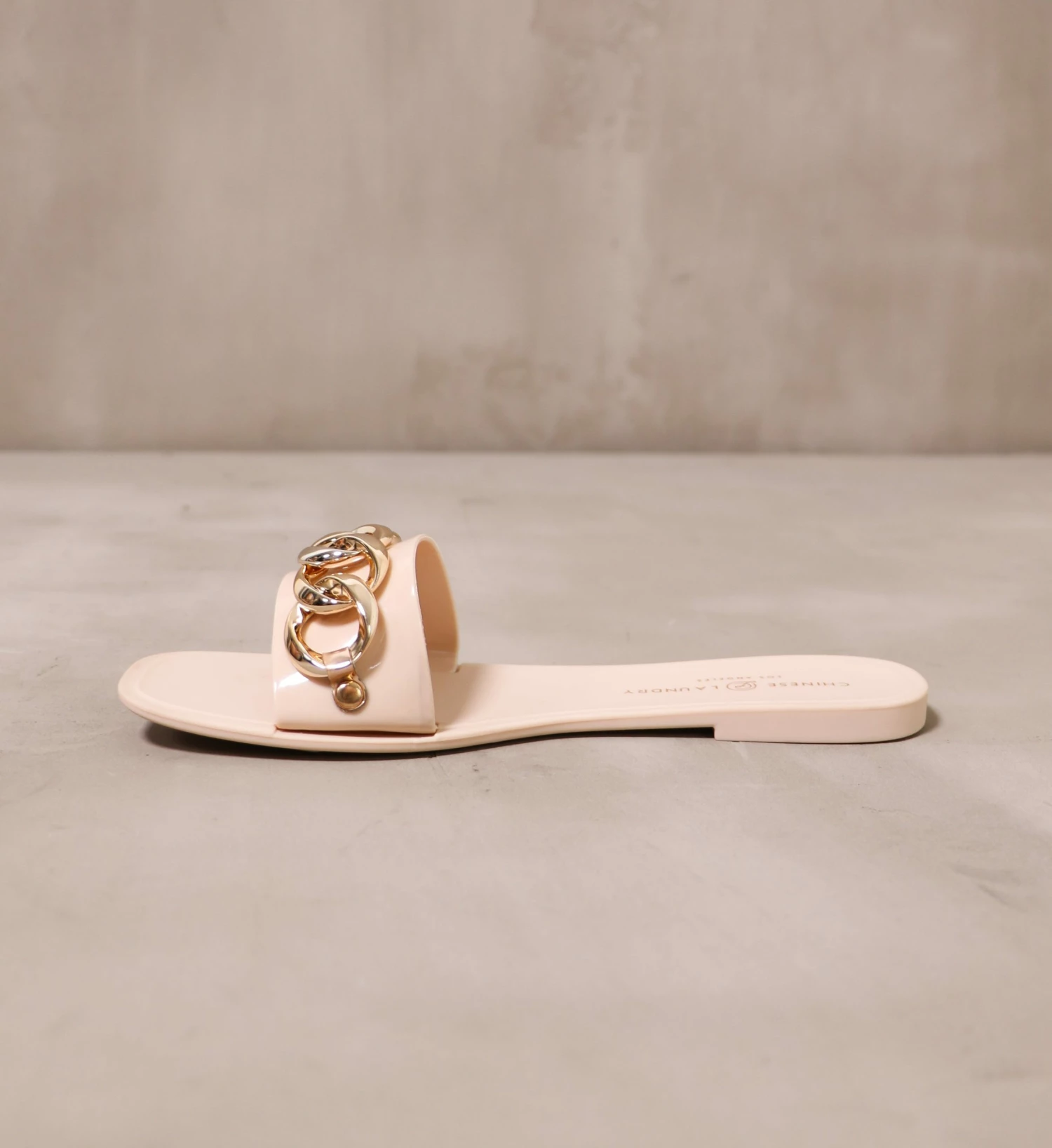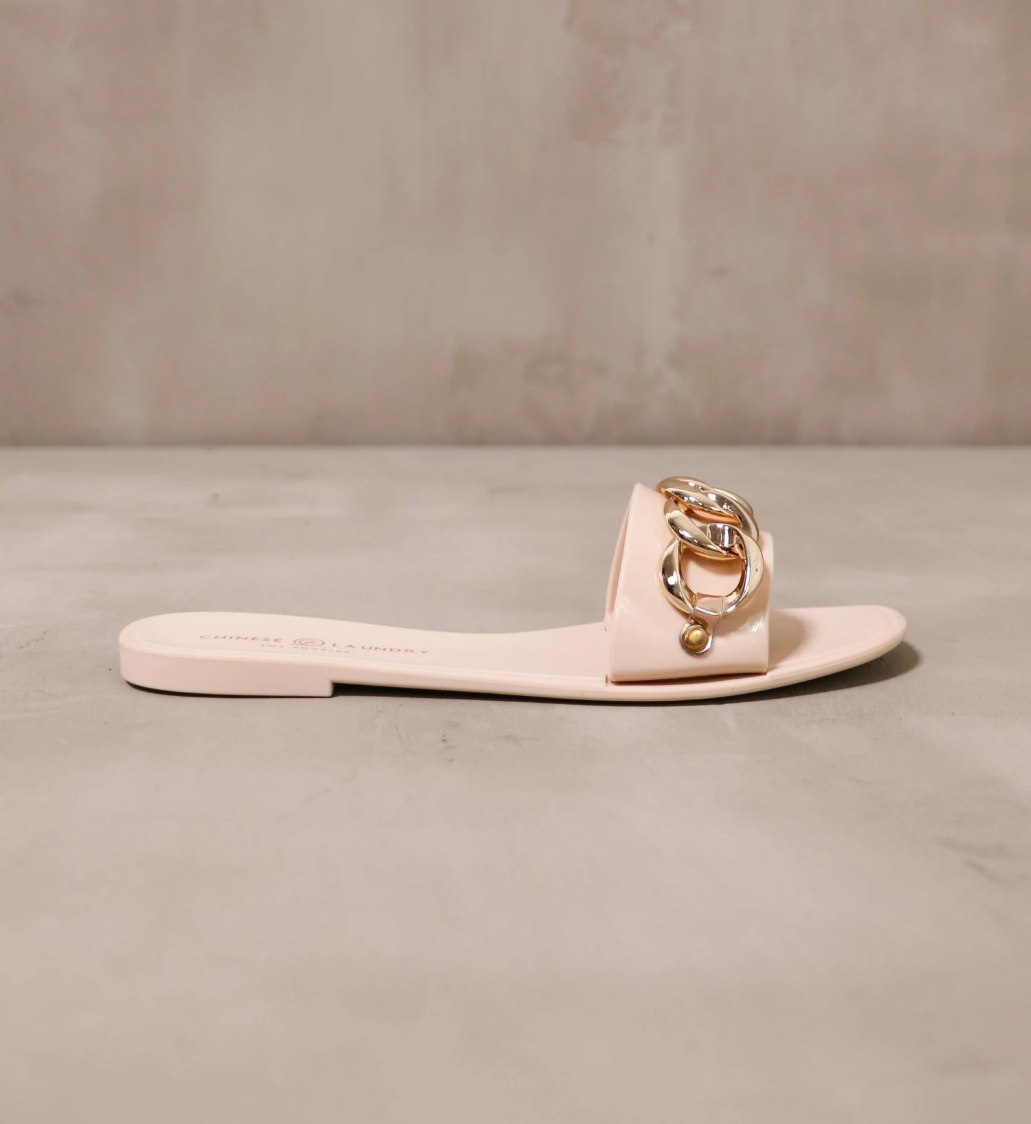 Made with a solid rubber sole, faux gold chain detail, flexible materials, and a shallow heel – these Chinese Laundry slides pair well with a bikini by the pool.