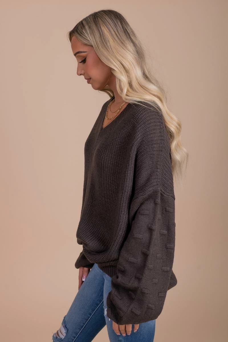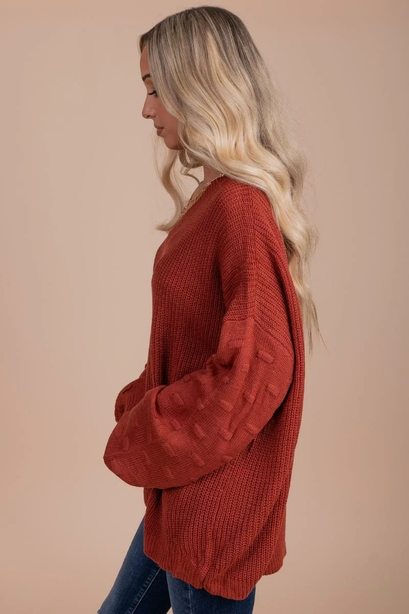 Our Fireside Flurries Knit V-Neck Sweater is so cute for the upcoming holiday seasons! This knit sweater features a v-neckline, two gorgeous color options, and puff sleeves! The long sleeves feature a textured dot detailing, making them so fun and unique! Pair your Fireside Flurries Knit V-Neck Sweater with your favorite jeans and booties to slay your holiday parties this year!