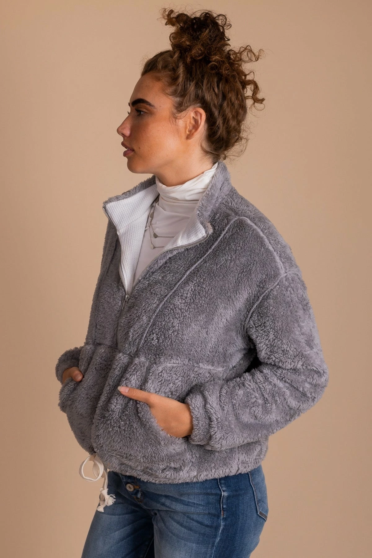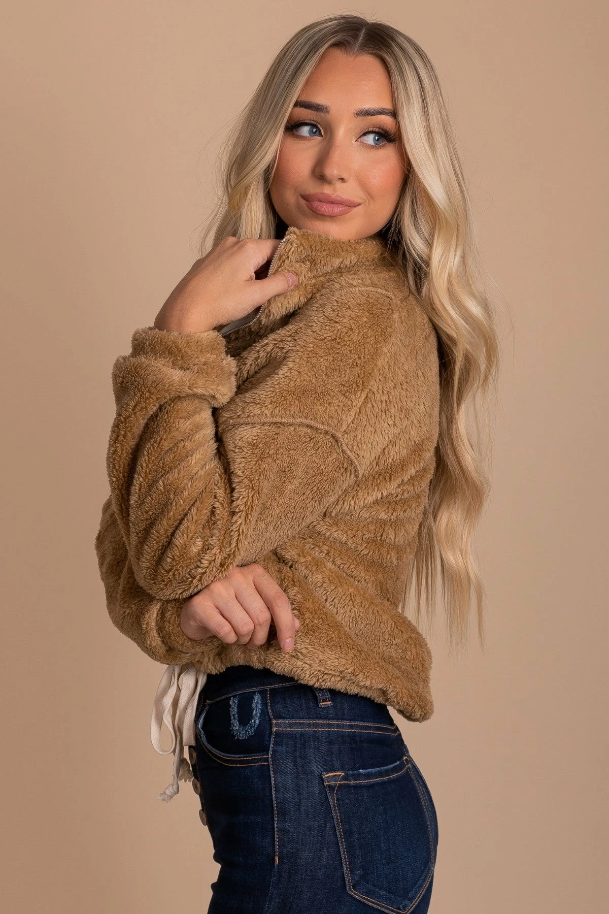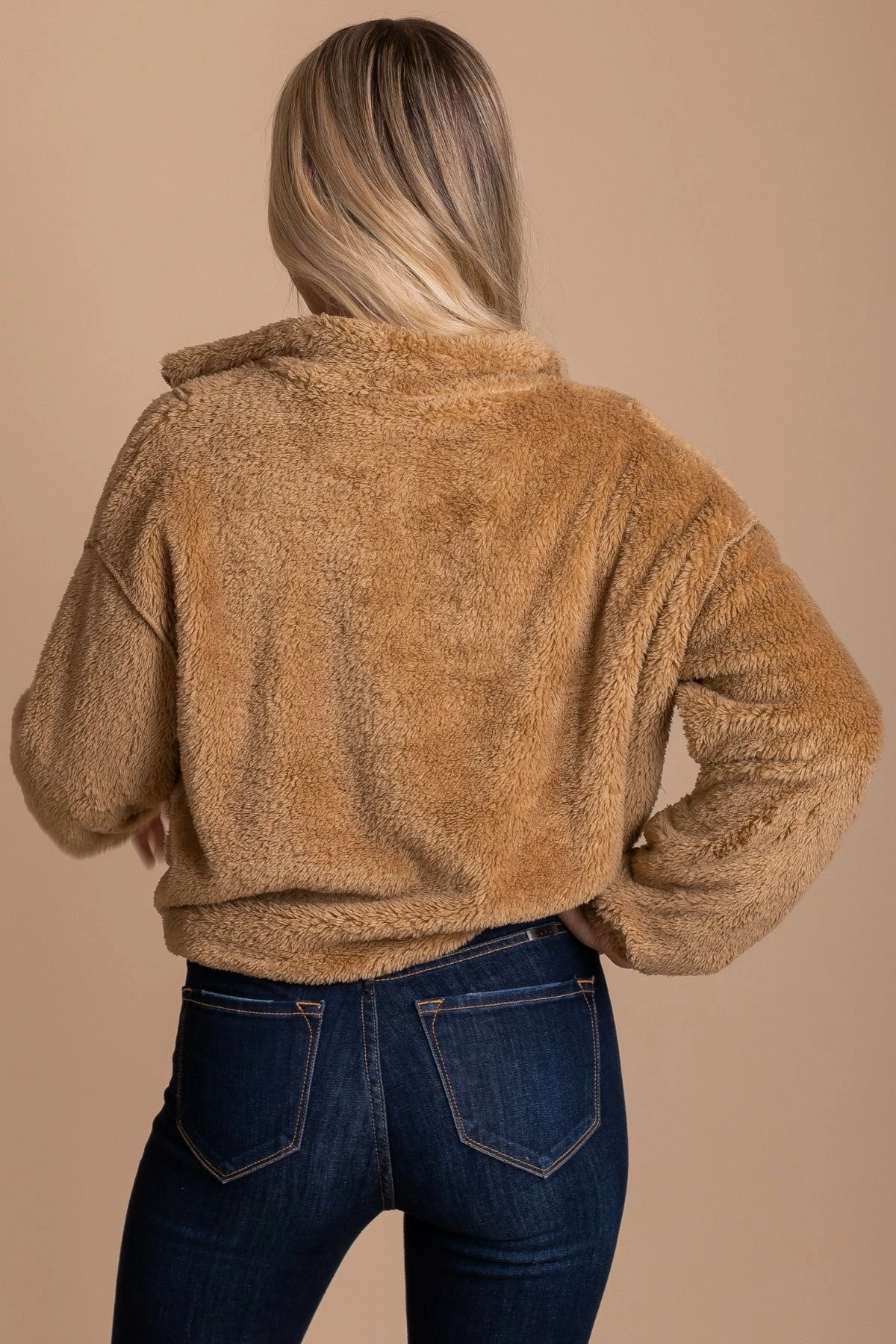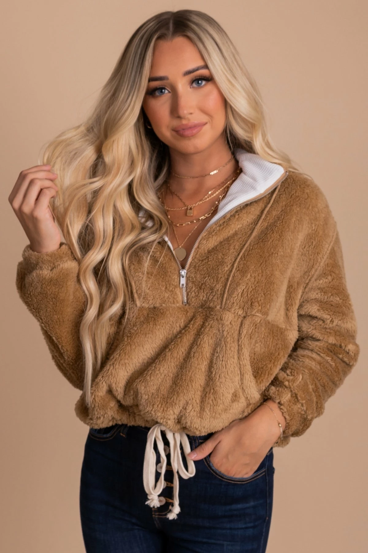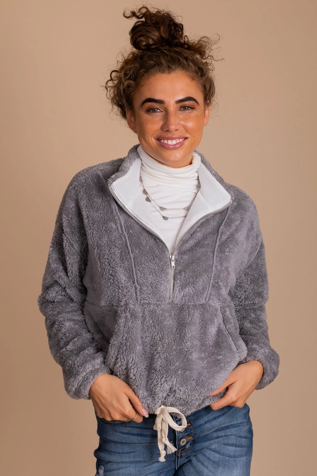 Pair yourΒ Cozy Morning Fleece Pullover with a turtleneck top and your favorite jeans for a trendy fall outfit!