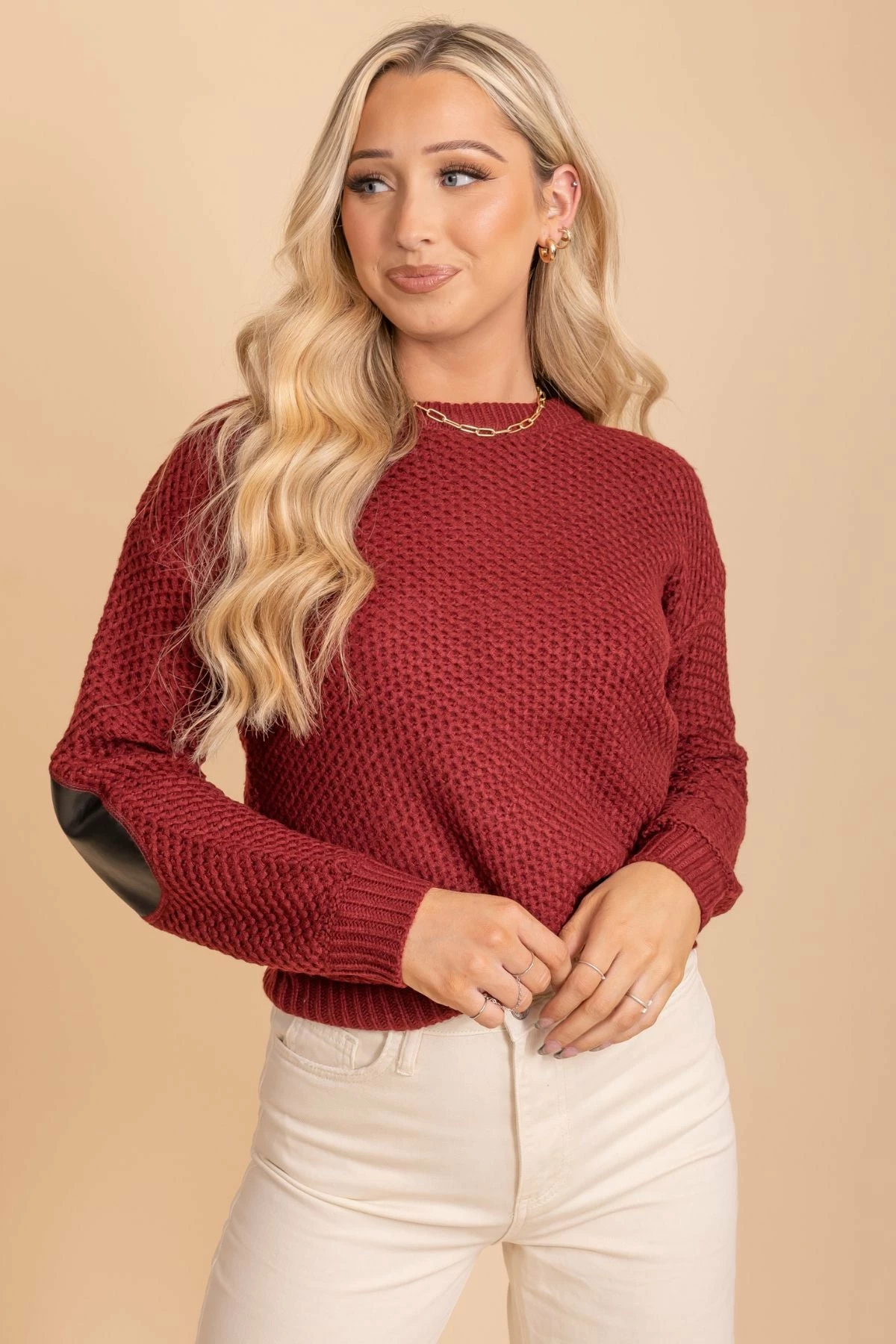 Our My Own Muse Knit Pullover Sweater is perfect for fall! This sweater features two cute fall color options, long sleeves, and dark brown patchwork detailing on the elbows! The soft, warm knit material will keep you warm and comfortable all season long!