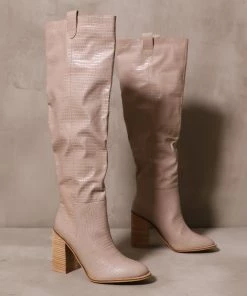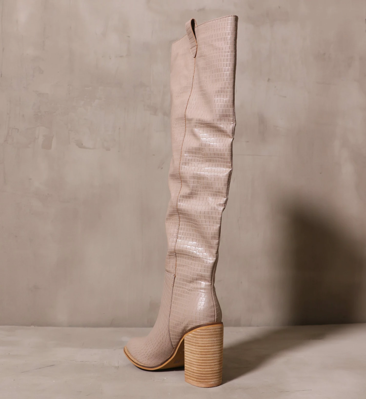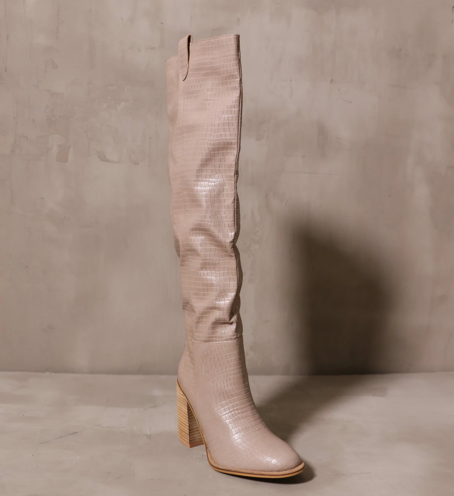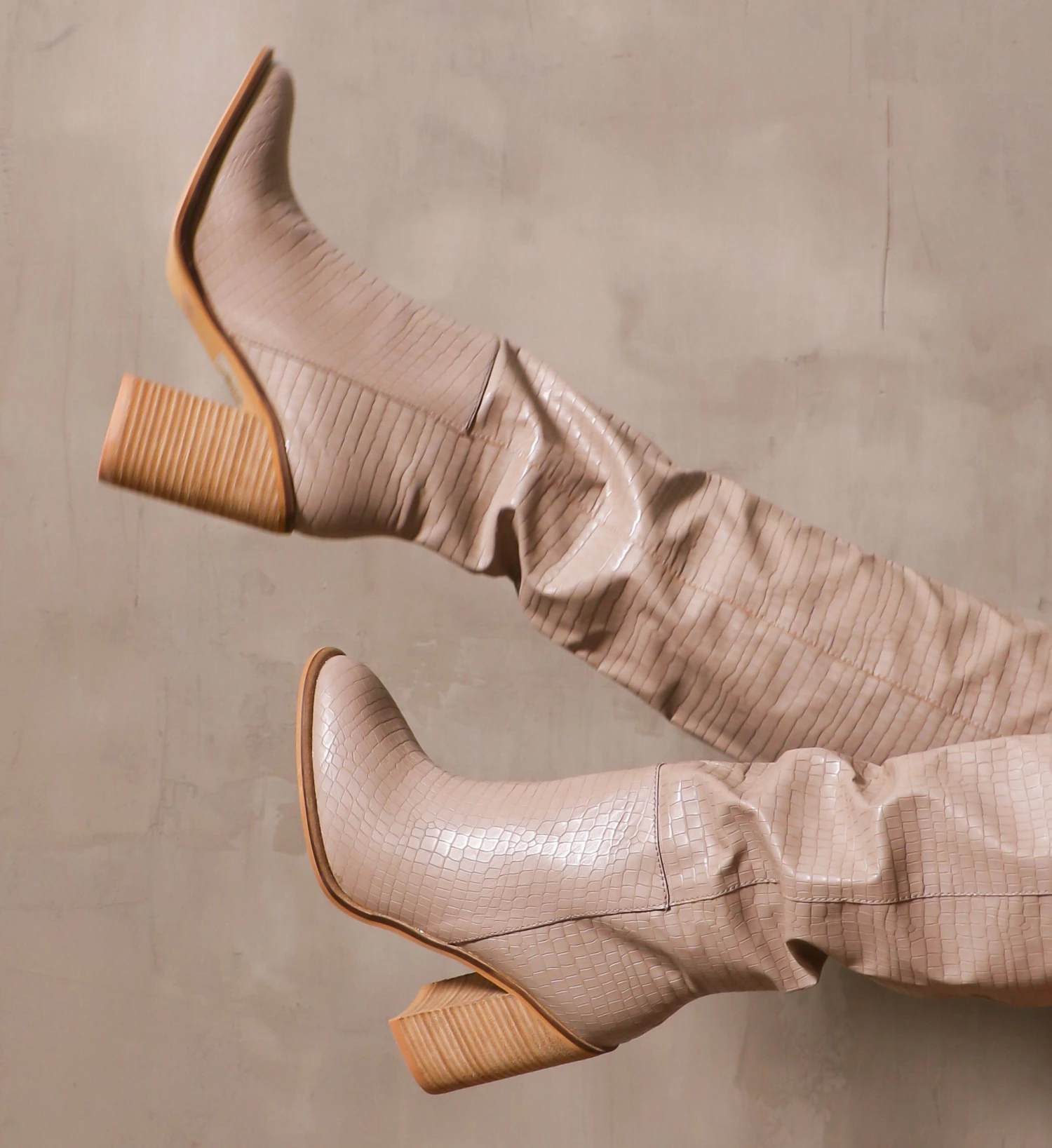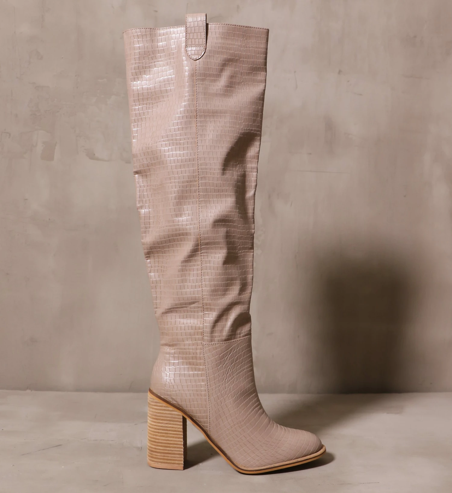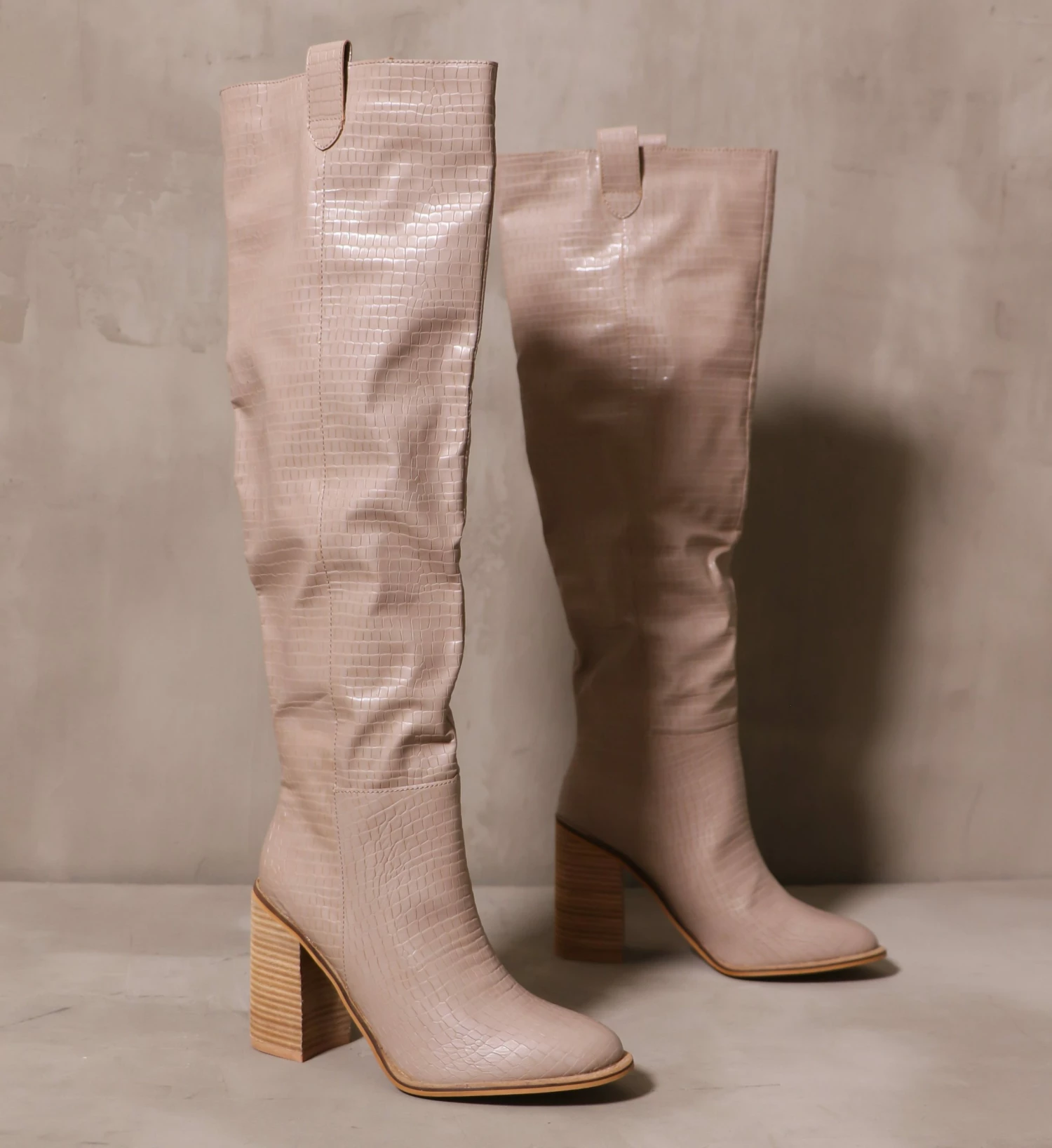 Add a pep to your step and a boost of height in these crocodile knee-high boots by Mi.iM.Β A buttery-soft lining and a stacked wood heel makes these beauties a closet must-have.Β Throw on a mini dress, pull on these boots, and think tall.