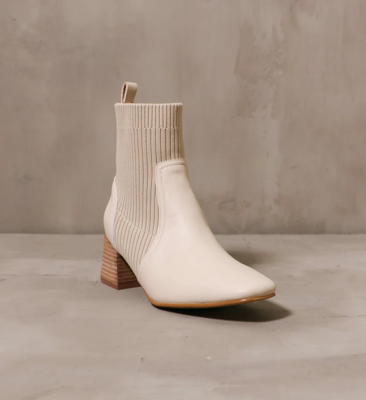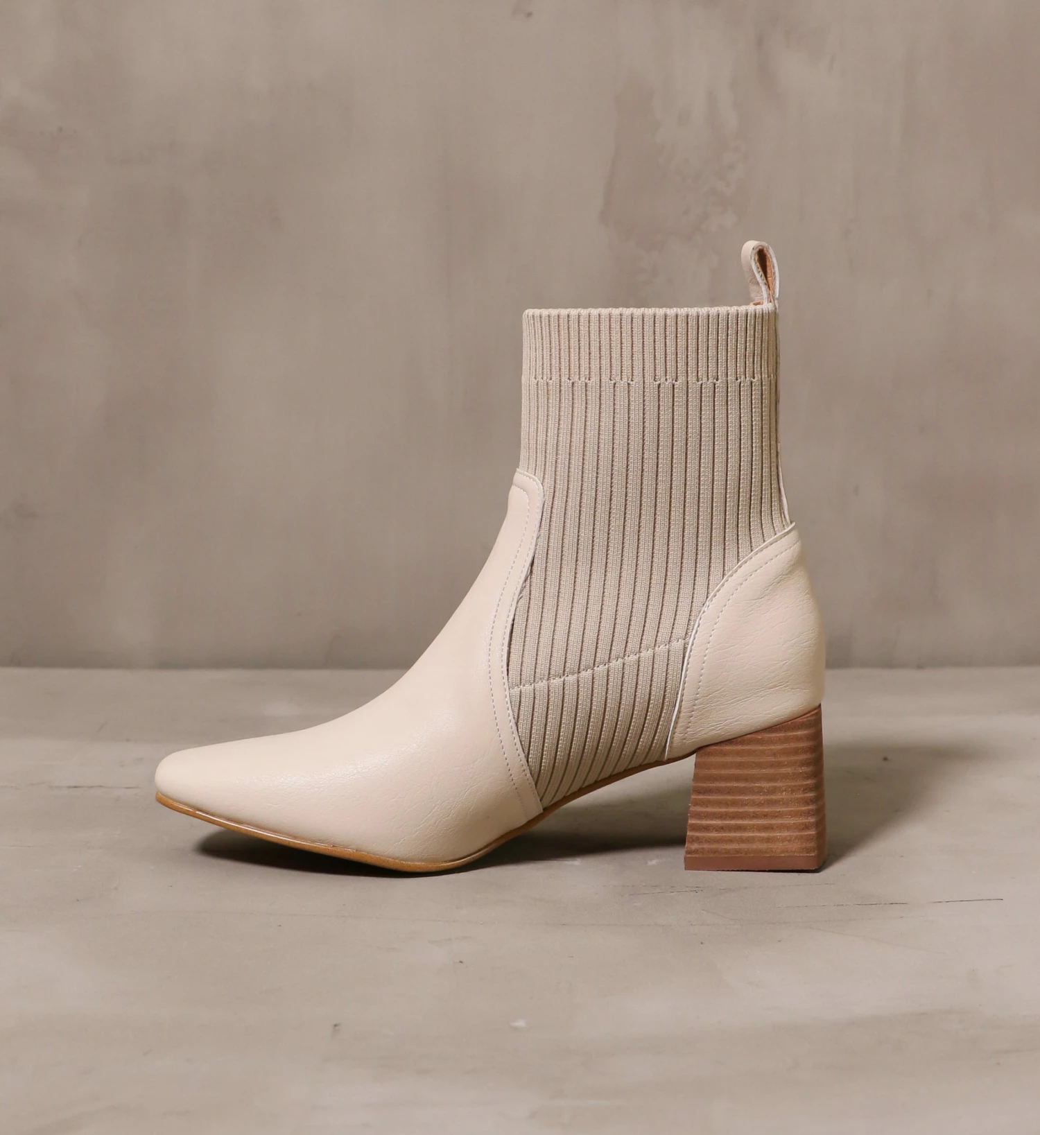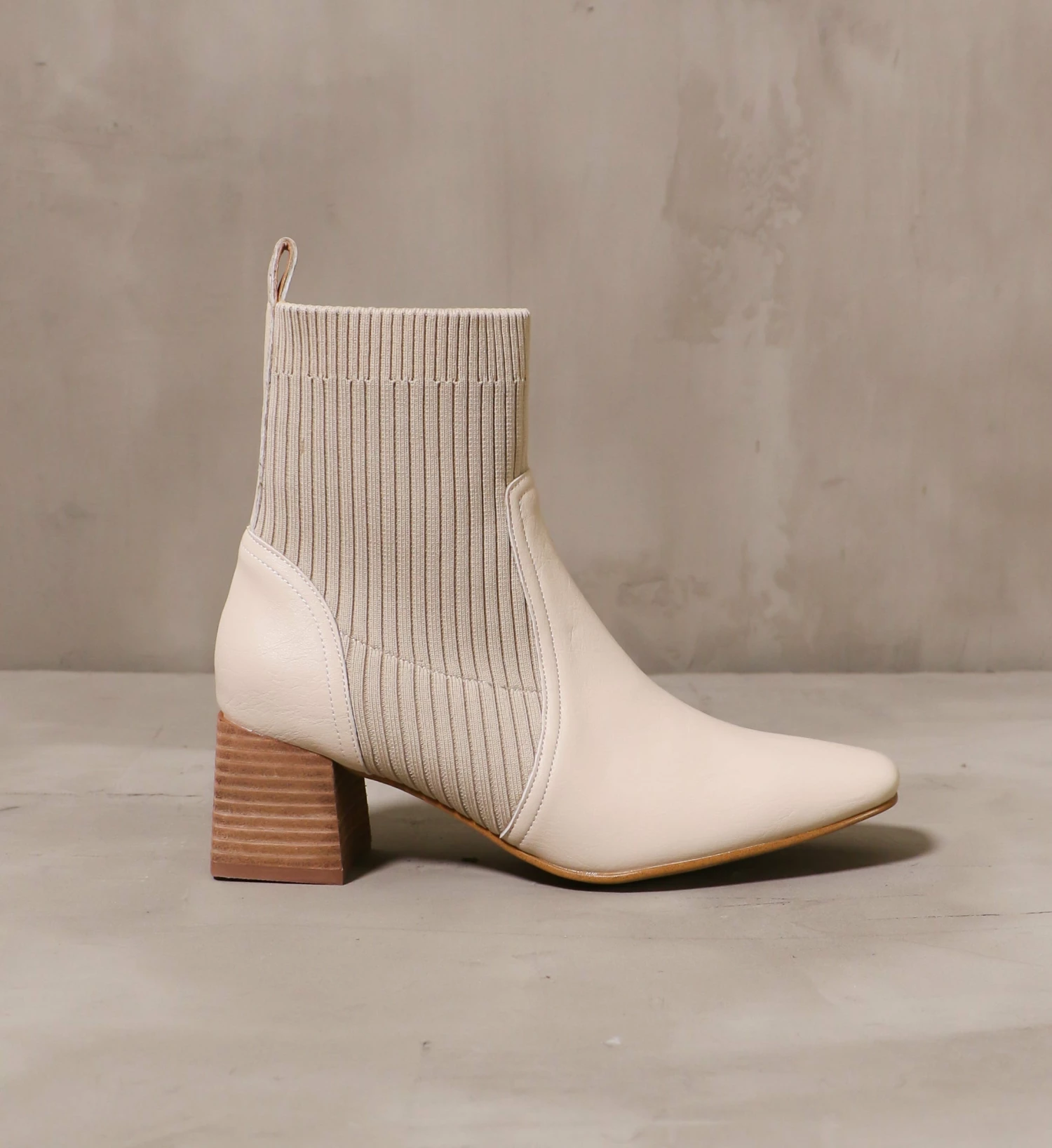 A modern design by Oasis Society, these trending booties feature a stretchy knit fabric between vegan leather panels.Β The block heel is made of stacked wood wrapped in leather to protect against scuffs.Β Pair with a boho dress for a year-round look.