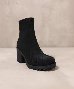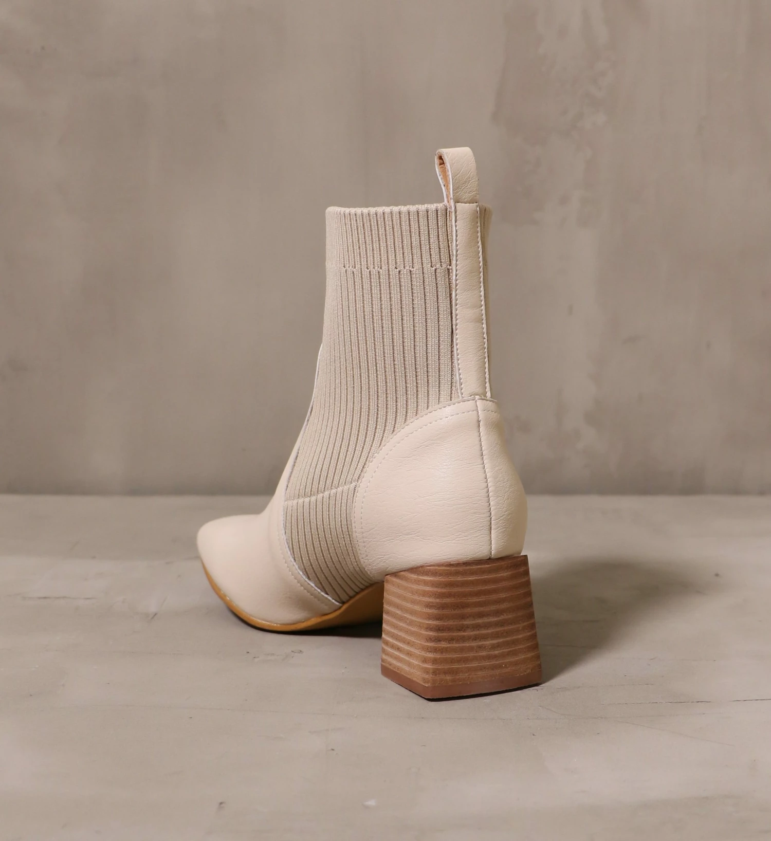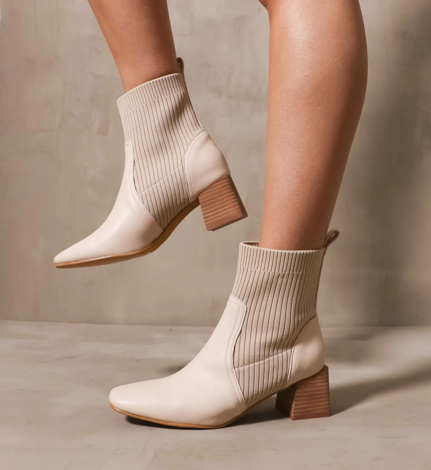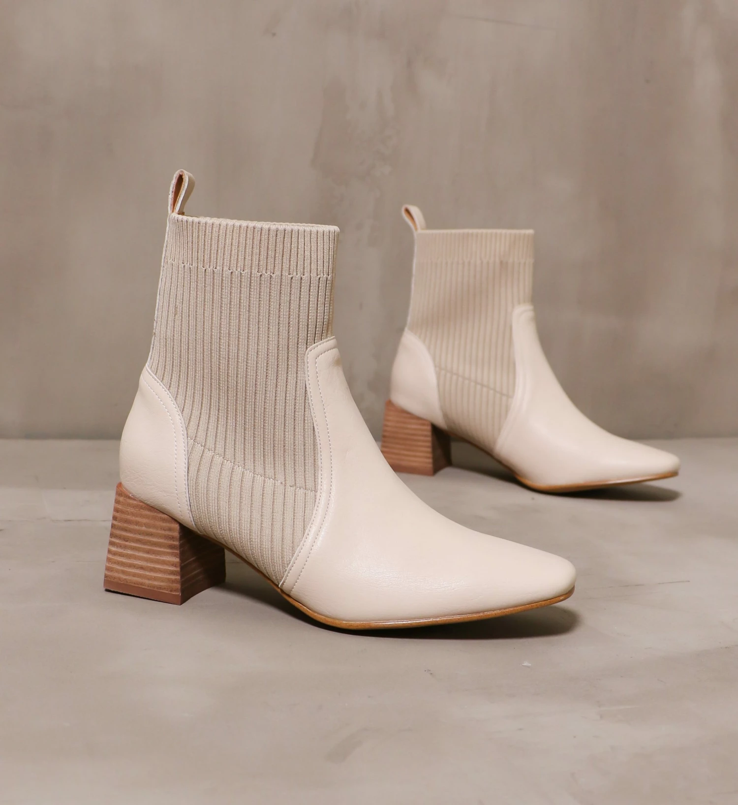 A modern design by Oasis Society, these trending booties feature a stretchy knit fabric between vegan leather panels.Β The block heel is made of stacked wood wrapped in leather to protect against scuffs.Β Pair with a boho dress for a year-round look.