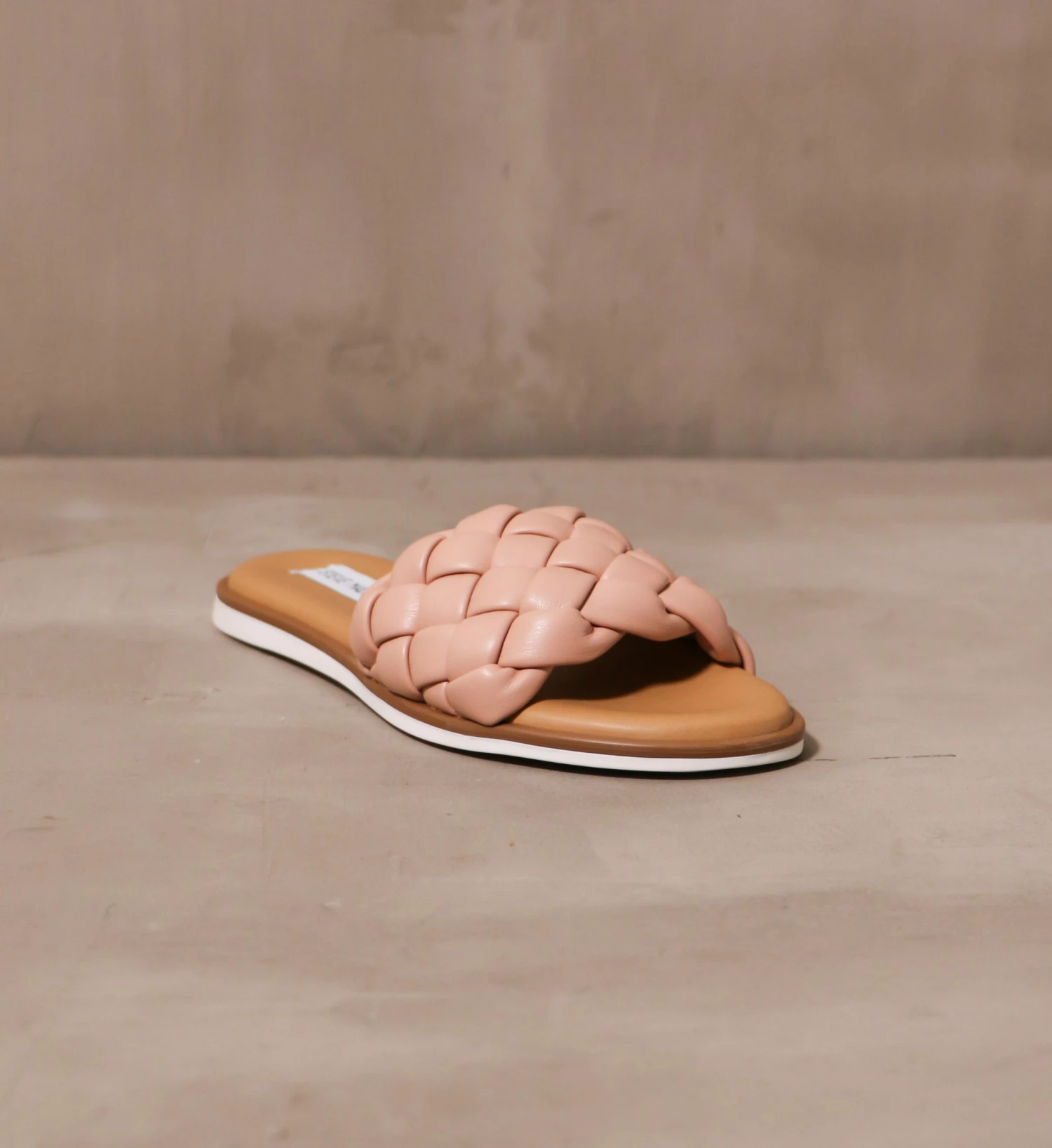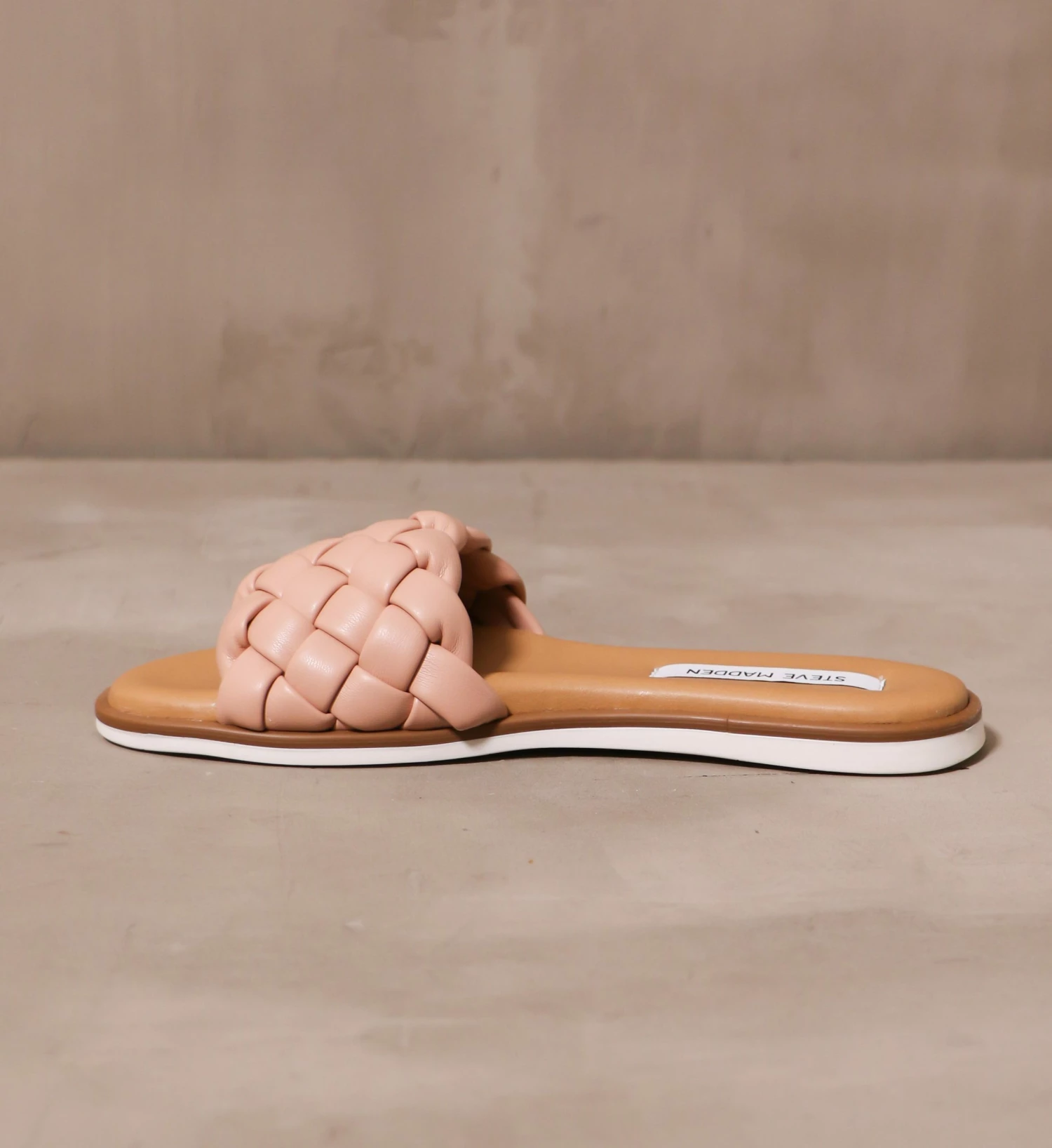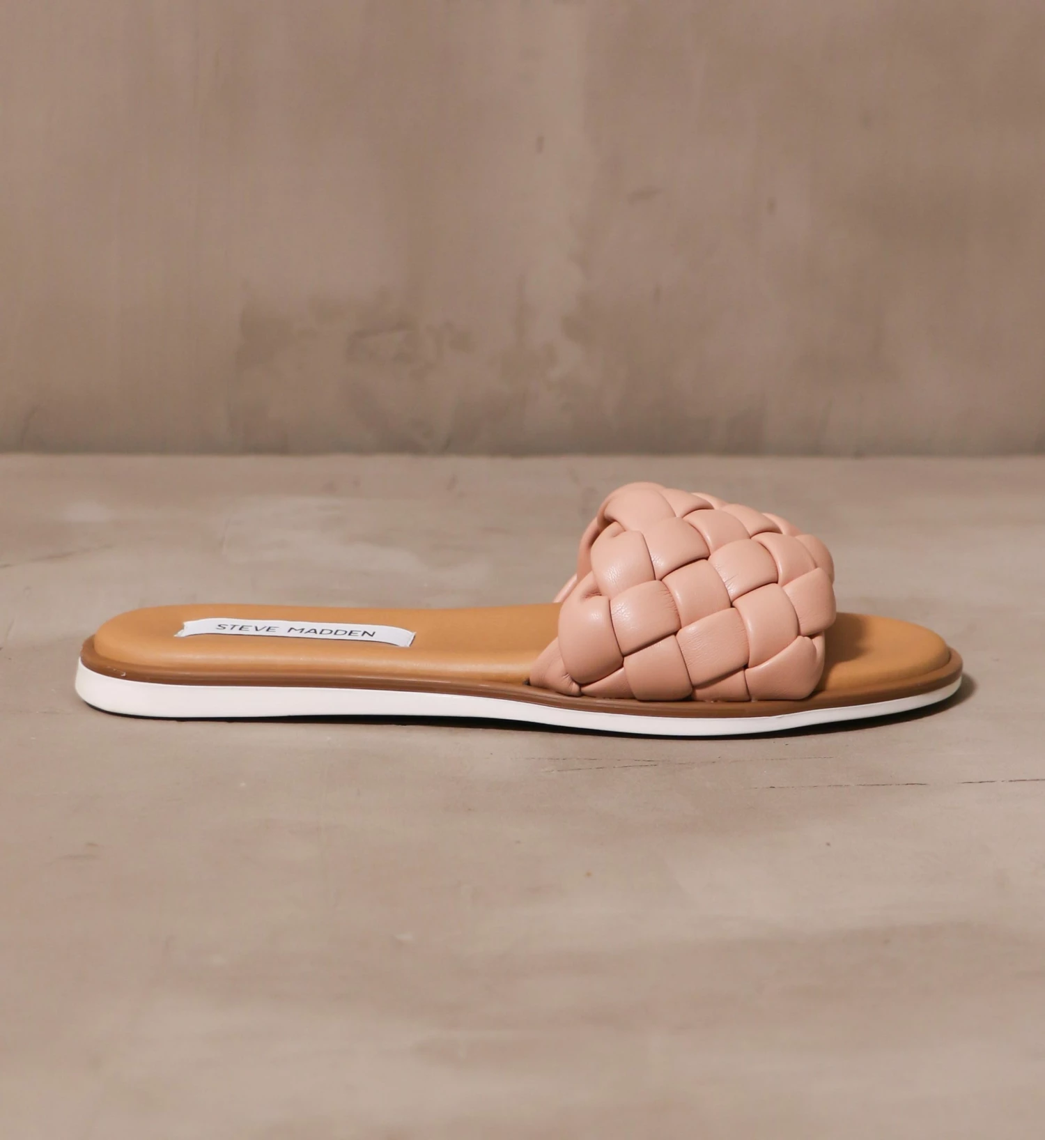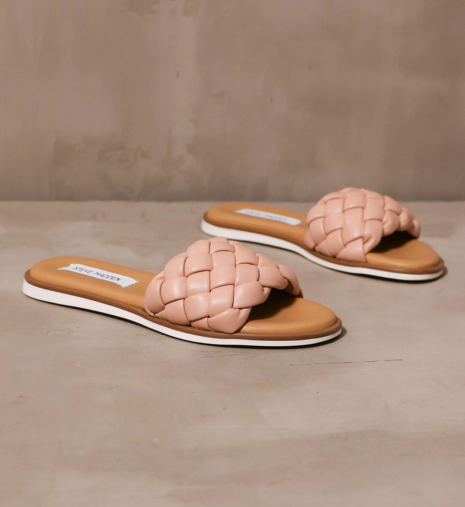 Comfortable and effortless, these slide sandals by Steve Madden are a warm-weather staple.Β With a cushioned insole, braided vegan leather straps, and a rubber tread, these slip on sandals will dress up any summer outfit.