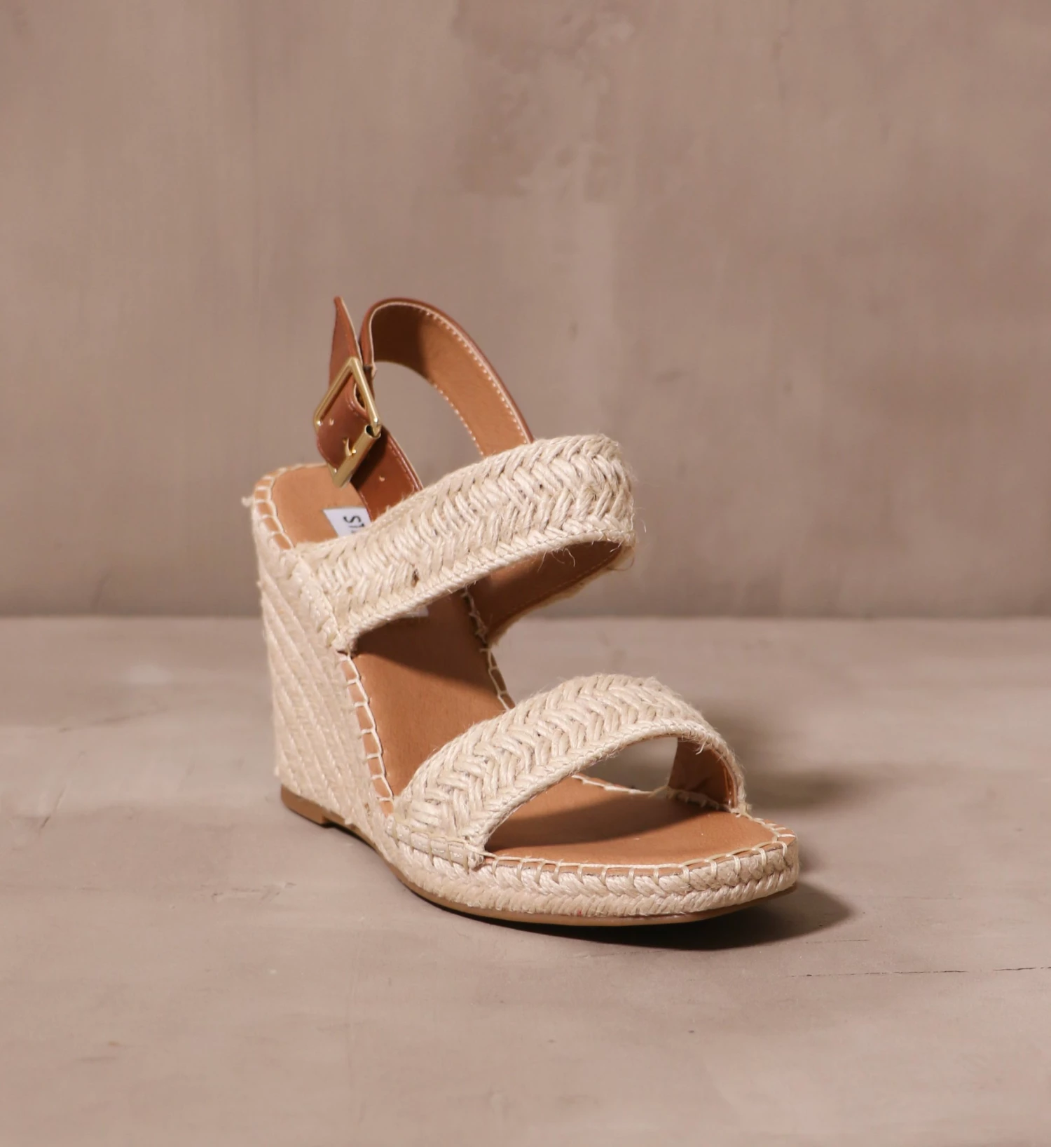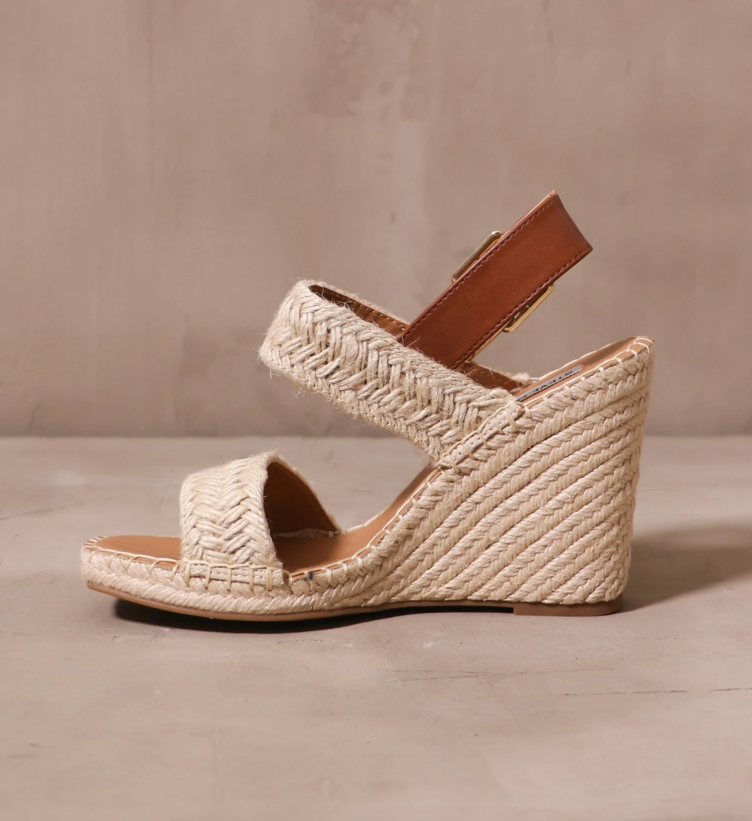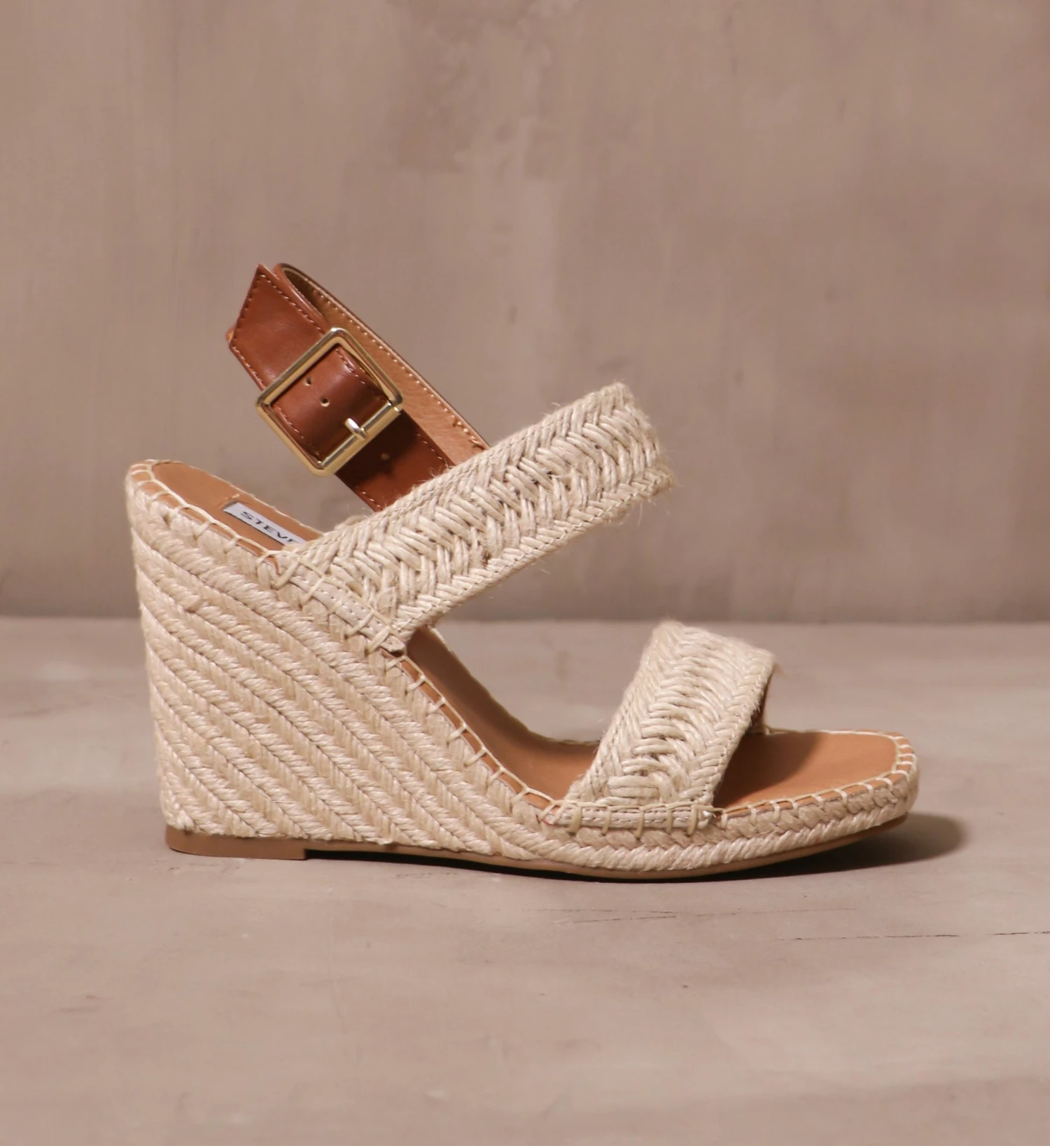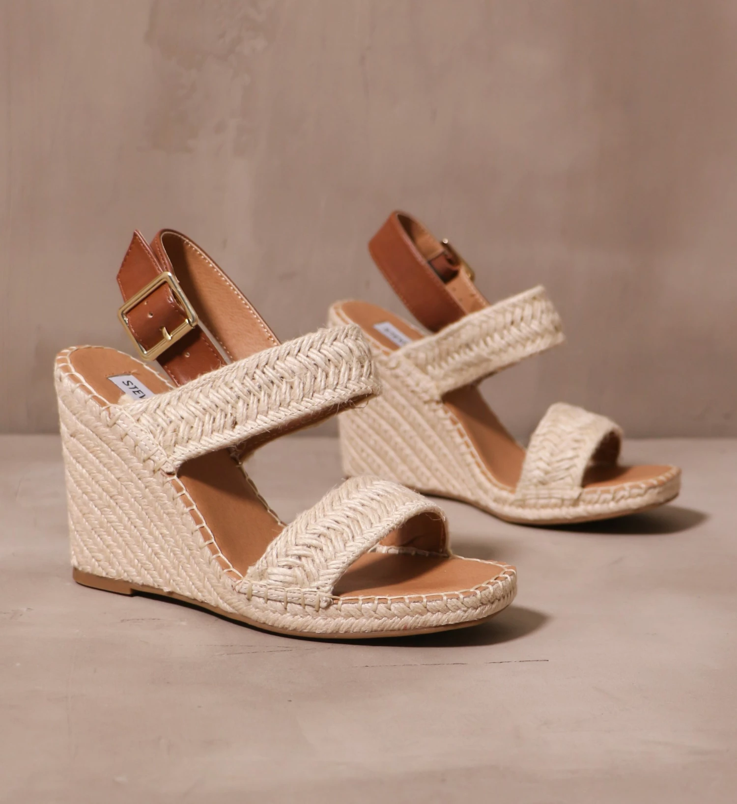 With Summer in mind, these lighweight wedges by Steve Madden are designed with braidedΒ raffia rope wrapping the 3.75″ heel.Β The vegan leather strap has an adjustable buckle to get just the right fit so these espadrille wedges are waiting to join your warm-weather wardrobe.