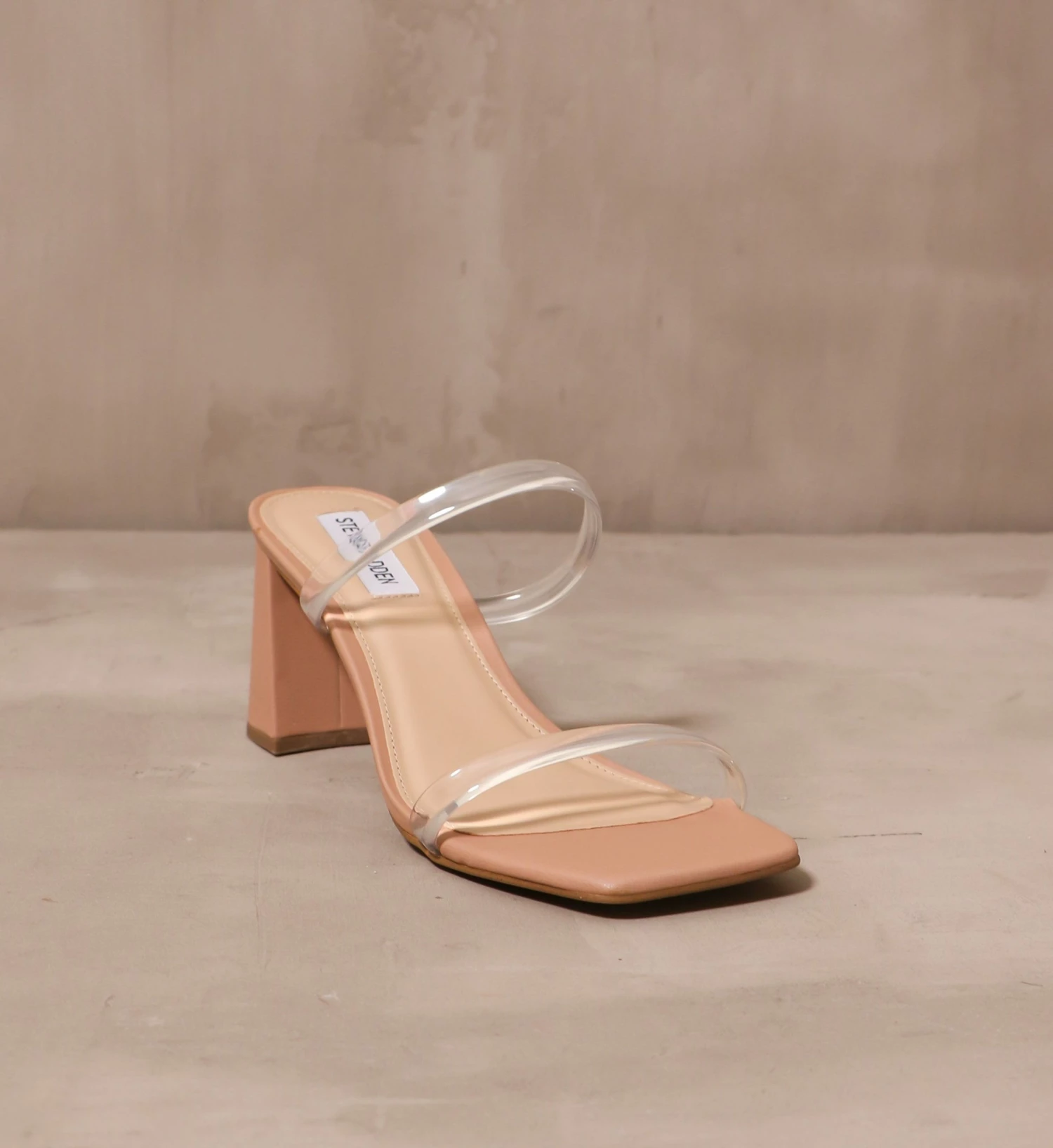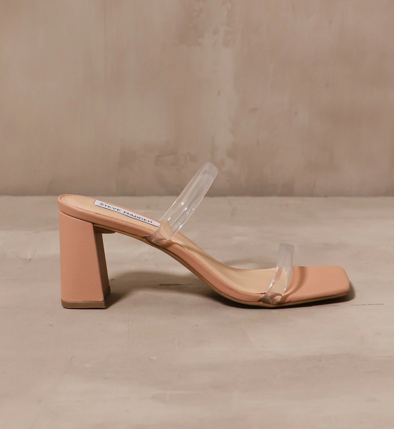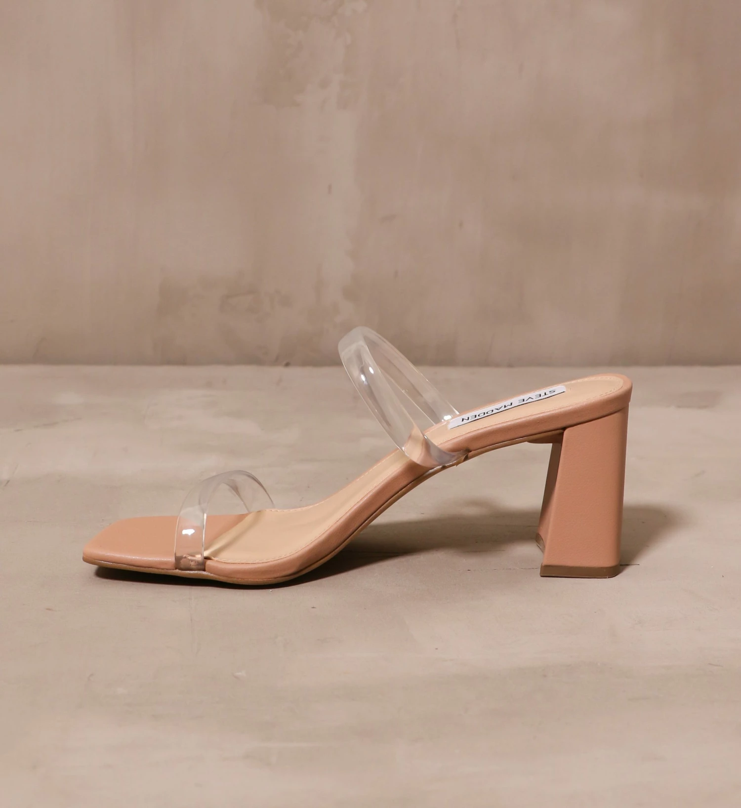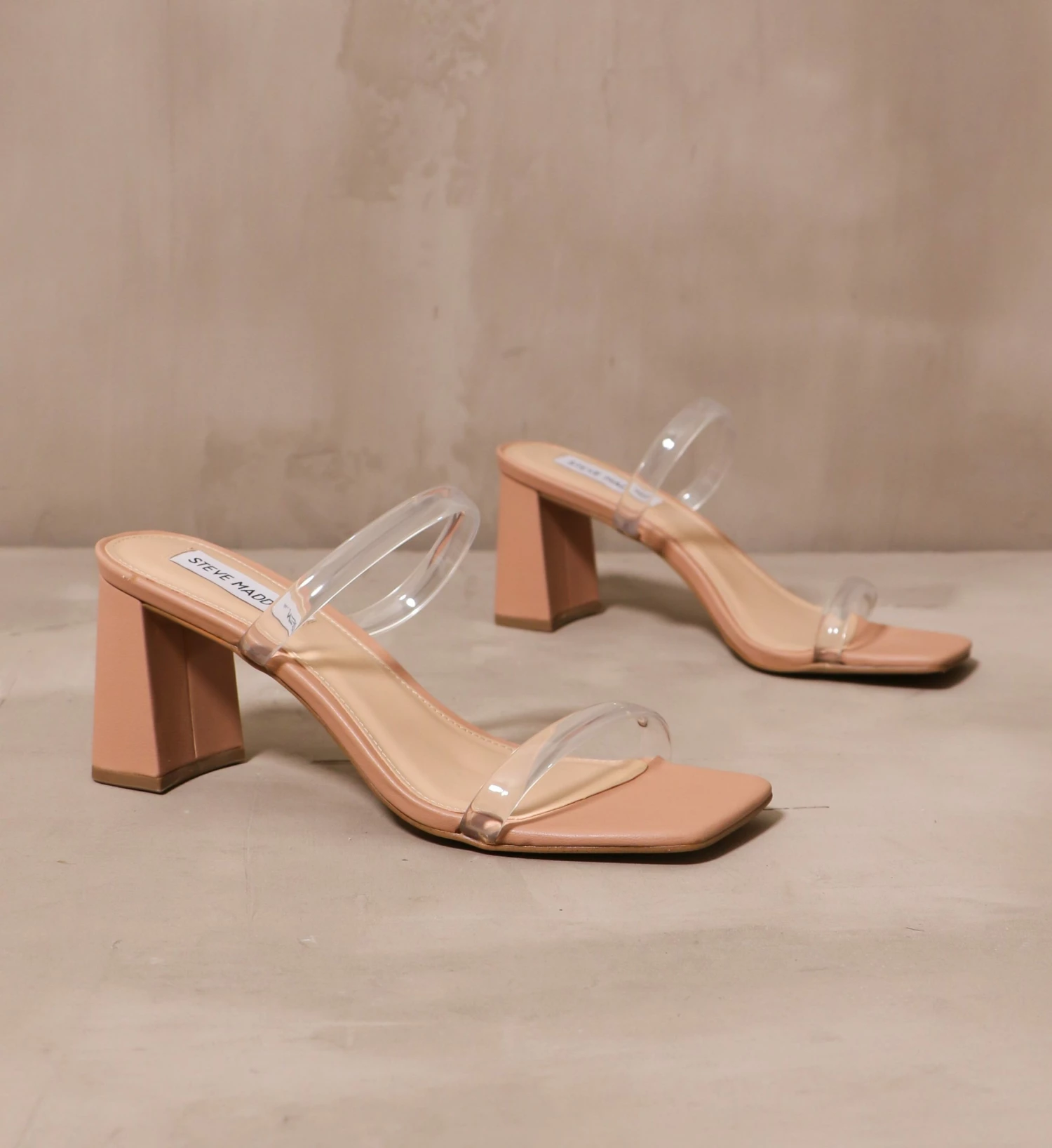 Simply designed by Steve Madden, these block heels are a formal favorite.Β With delicate thin straps, a vegan leather wrapped block heel, and a simple slip-on silhouette – these clear heels are translucently tremendous.