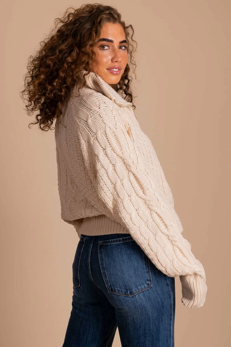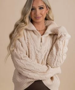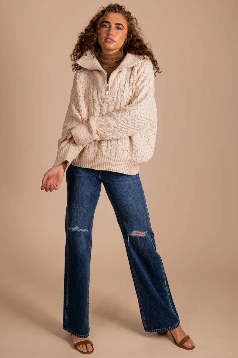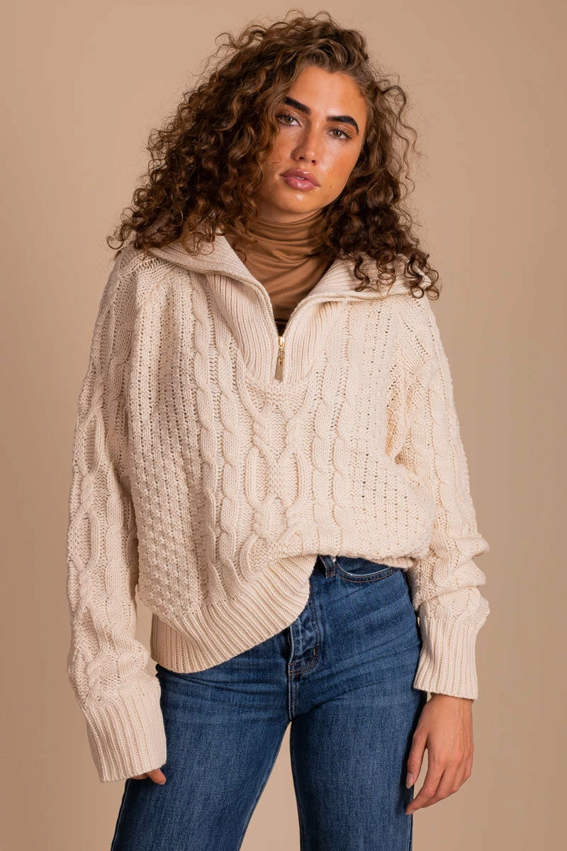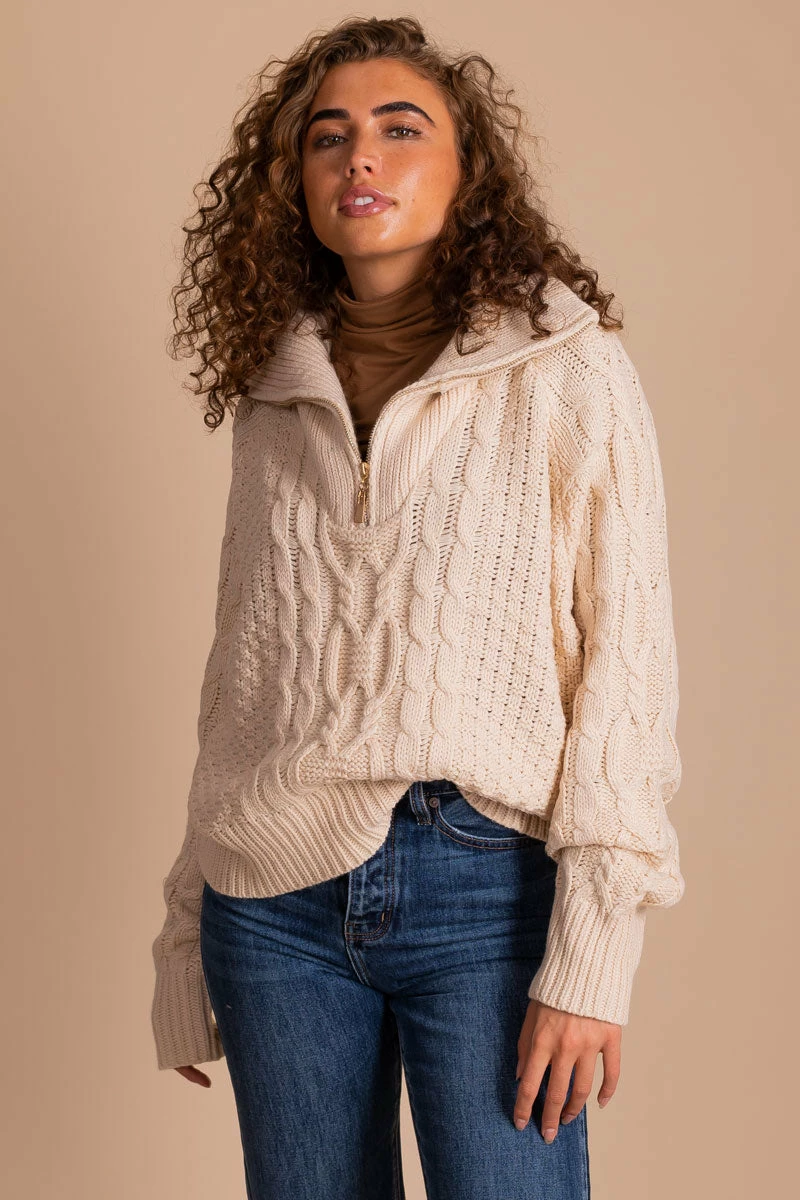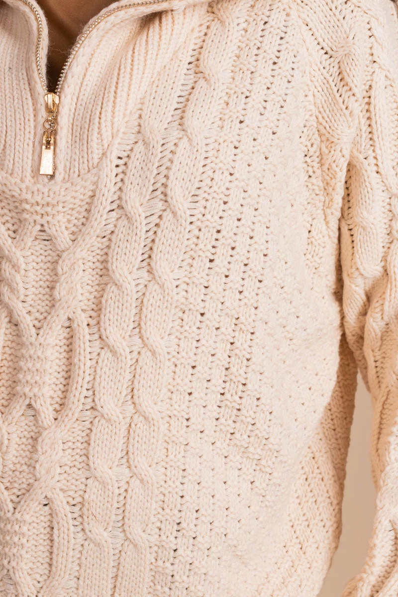 Our Warm Embrace Chunky Cable Knit Sweater is a winter staple! This sweater features an oversized fit, a half-zip detail, and chunky cable knit material! This cream color makes this so easy to layer with anything!