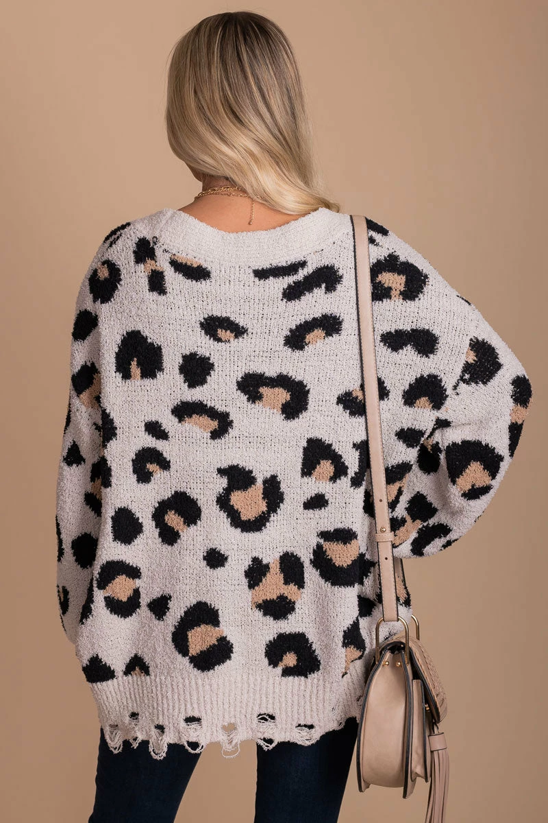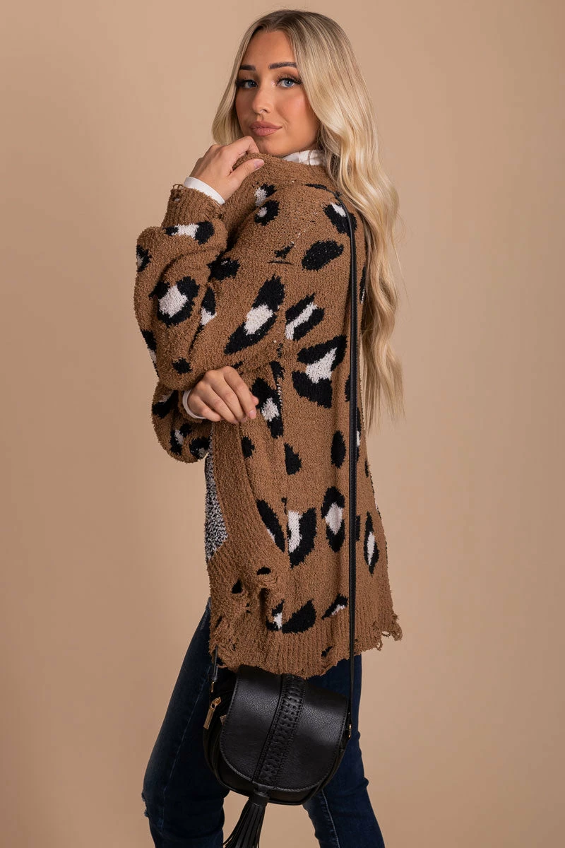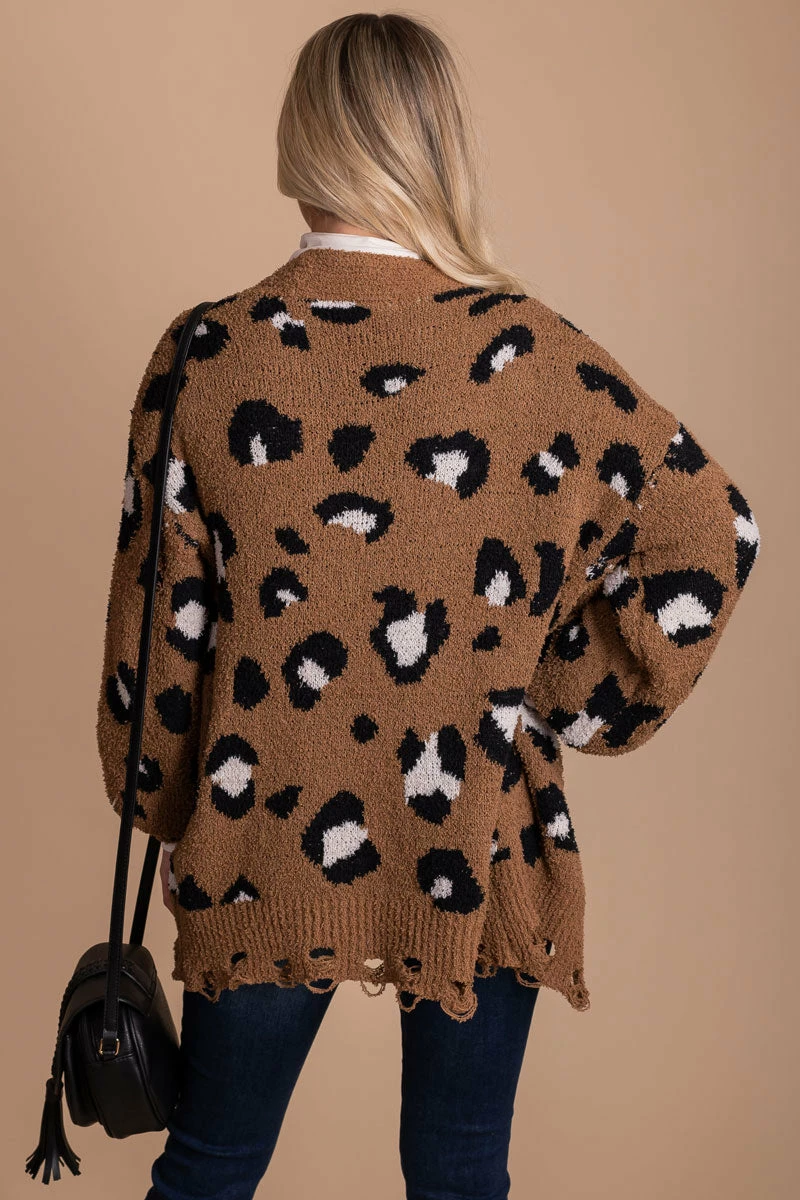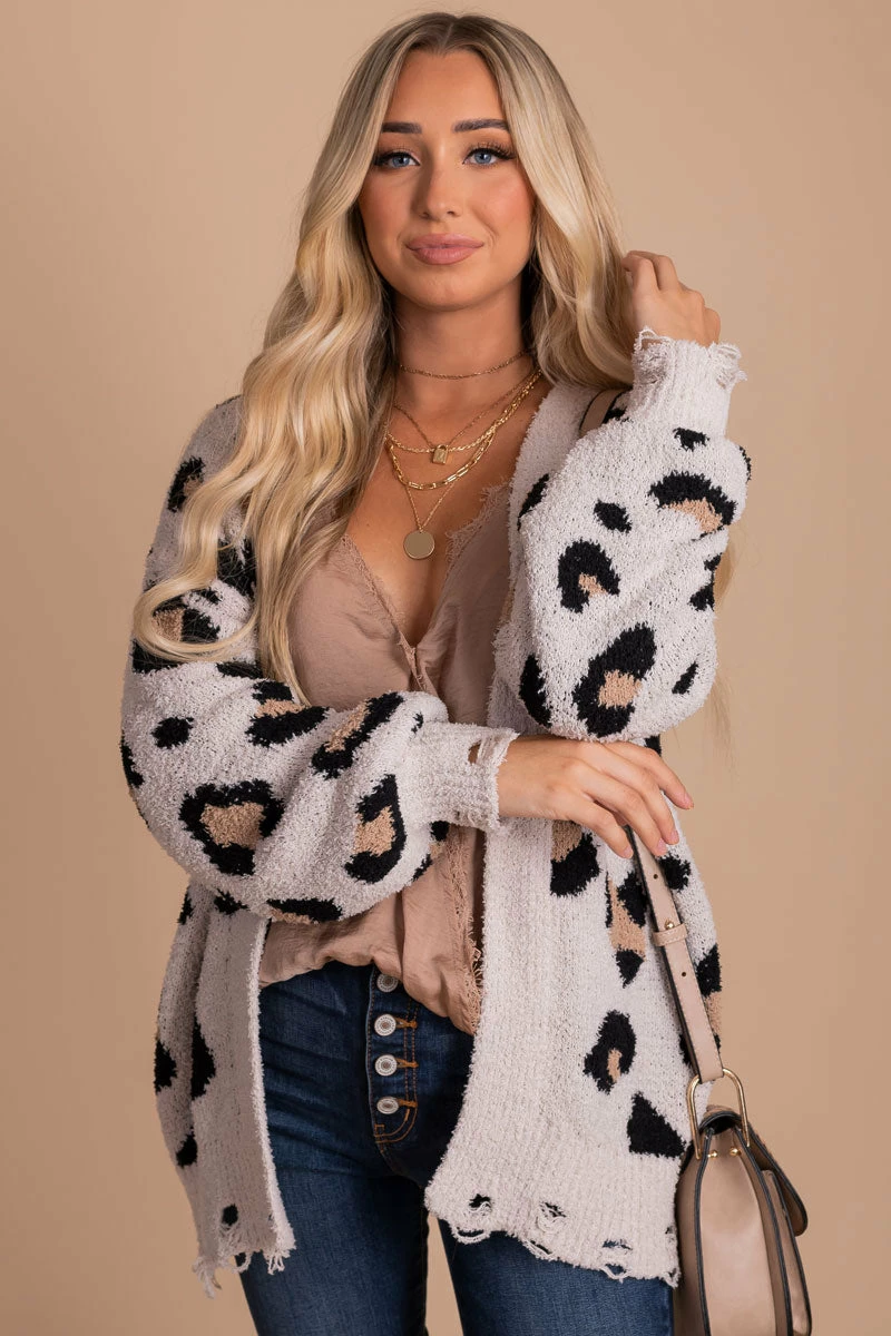 Our Run Wild Leopard Print Cardigan is a fall must-have! This cardigan features a trendy leopard print pattern, oversized fit, and two cute color options! The subtle distressed detailing adds the perfect finishing touch!
