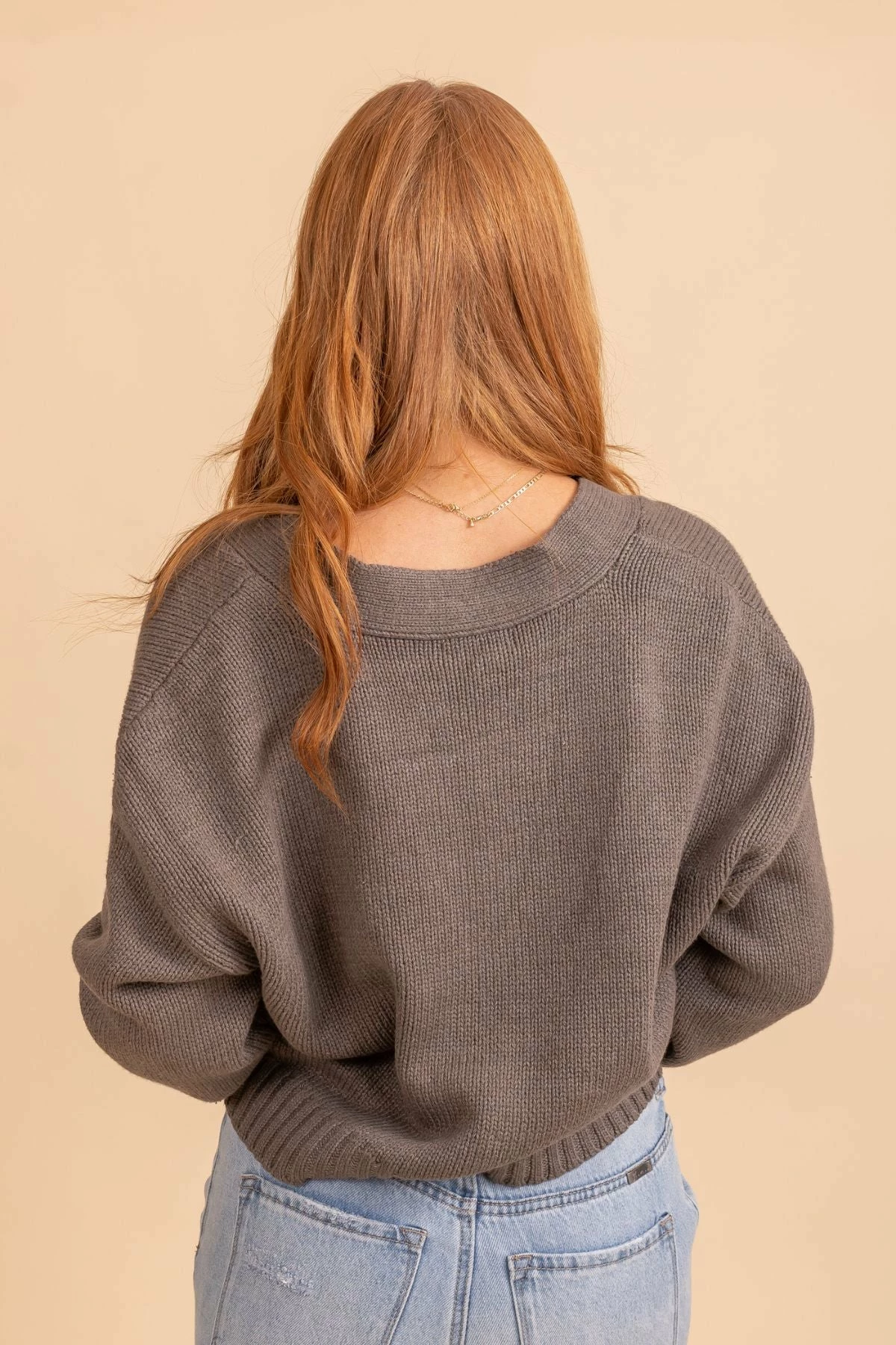 - Our In the Moment Buttoned Up Cardigan is a must for the upcoming seasons! This knit cardigan is so soft and has the best knit material. This dark gray cardigan is perfect for layering up or dressing down.