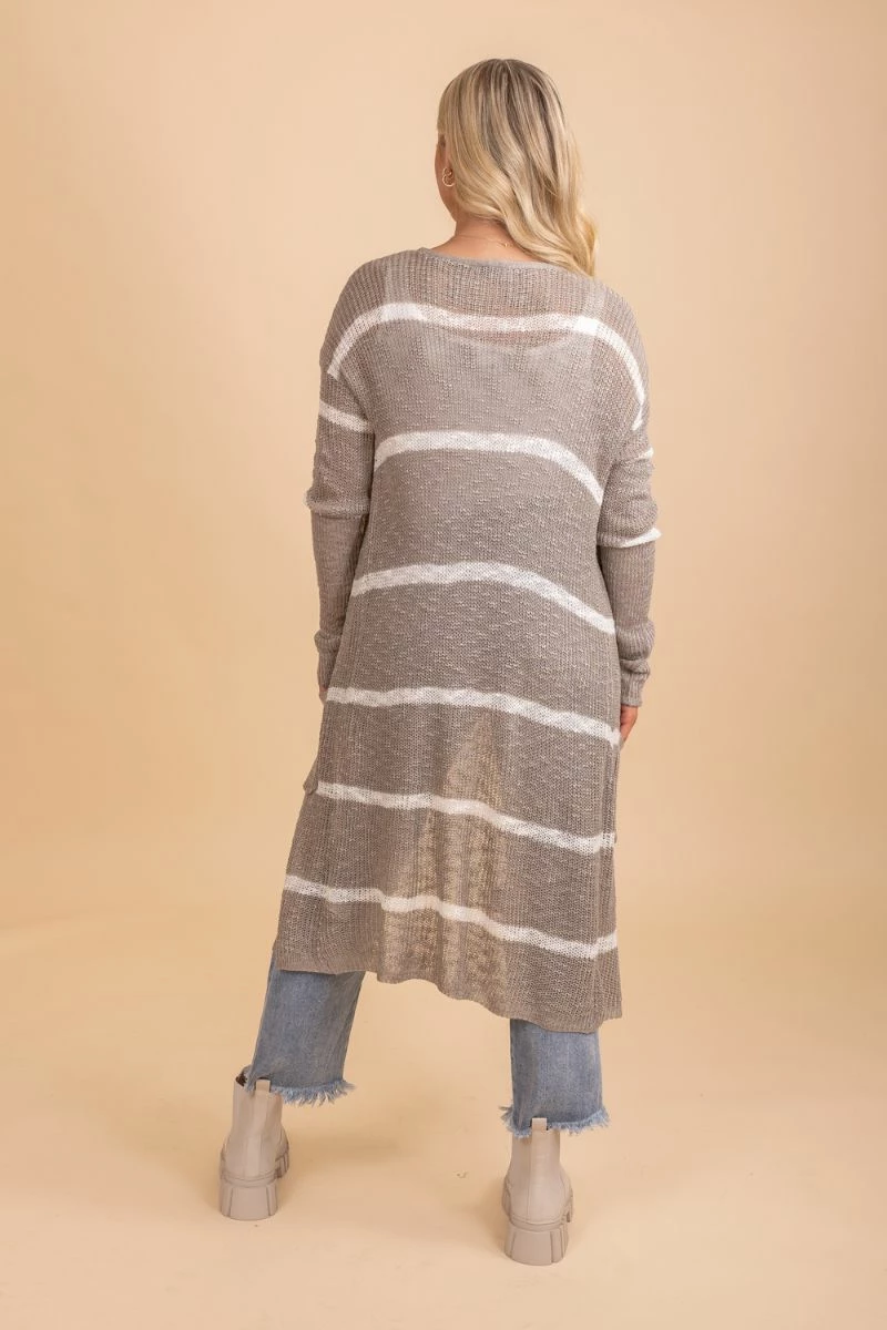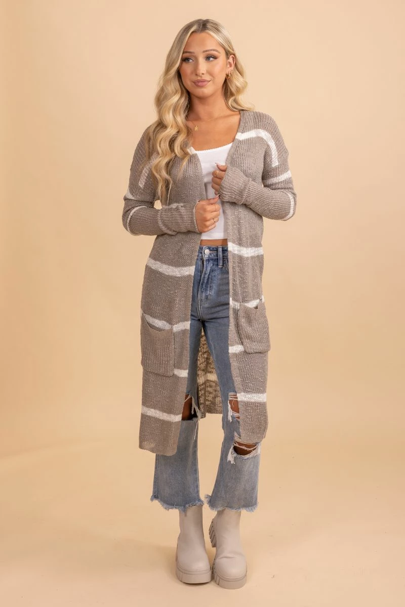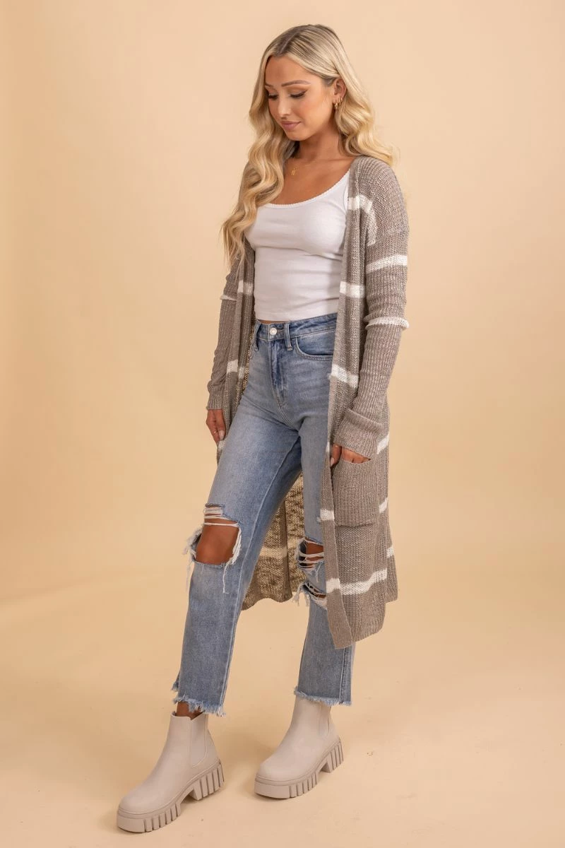 Say hello to fall in our new Speak Beautiful Things Long Striped Cardigan! This cardigan features a beautiful gray and white striped pattern. We’re obsessed with the high-quality knit material and long fit! The longer length makes it perfect for layering.